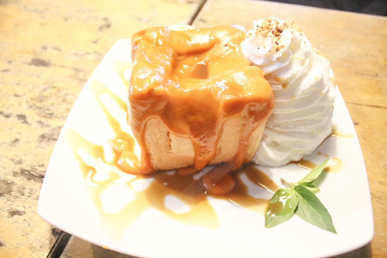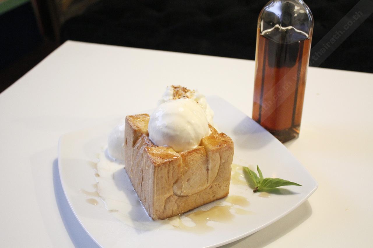 เป็นขนมปังที่ผ่าแล้วทาเนยอบด้านในแล้วก็ทานคู่กับไอศกรีมวานิลลา แล้วก็ราดด้วยน้ำผึ้ง และถ้าใครยังไม่จุใจในความหวานหอมก็สามารถเติมน้ำเมเปิ้ลเพื่อเพิ่มรสชาติได้ตามที่เราชอบที่ทางร้านเตรียมไว้ให้ด้วย อันนี้เป็นเมนูที่ยอดฮิตมาก เพราะเป็นของหวานที่ใครมาที่นี่ก็ต้องนึกถึง พอได้ลิ้มรสขนมปังอบเนยที่กรอบหอมเข้ากับไอศกรีมเย็นๆ หวานชุ่มคอ ราดกับเมเปิ้ล ทำให้ลืมความร้อนไปได้ทันที