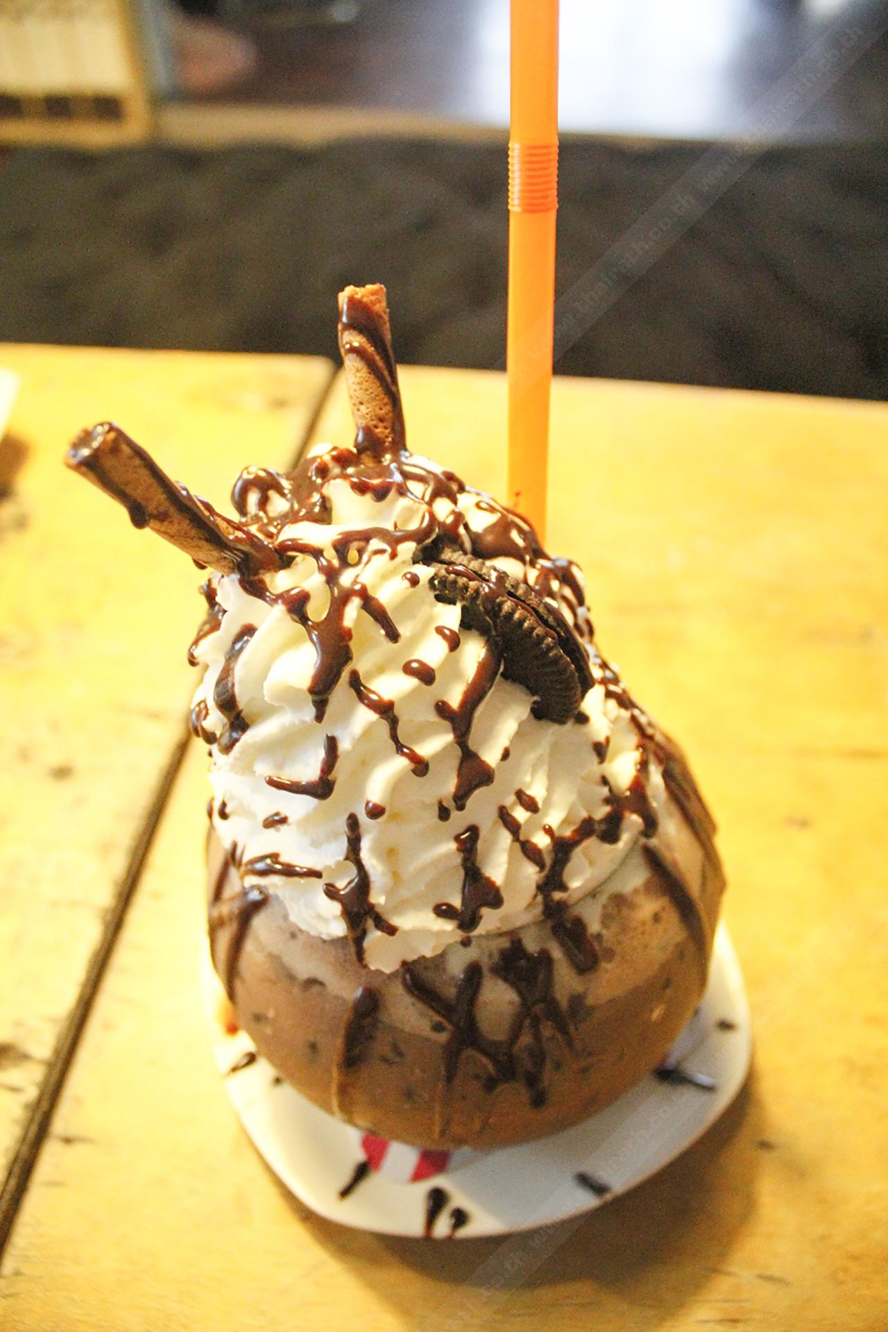 ก็อาจจะคิดว่าเป็นน้ำช็อกโกแลตธรรมดาๆ แต่เมื่อเห็นรูปร่างที่แปลกใหม่ ที่อื่นอาจจะเป็นแก้วธรรมดาแต่ที่นี่จะมาเป็นโอ่งชุ่มไปด้วยวิปปิ้งครีม และตกแต่งด้วยโอริโอ้ที่เข้ากันที่สุดแถมรสชาติยังเข้าขั้นมาก ทางร้านบอกว่าจะสั่งช็อกโกแลตมาจากร้านที่ไว้ใจ แต่จะมีกรรมวิธีที่มาผสมเอง ทำให้มันมากกว่าโกโก้เย็นธรรมดา เพราะเลือกใช้วัตถุดิบที่มีคุณภาพ