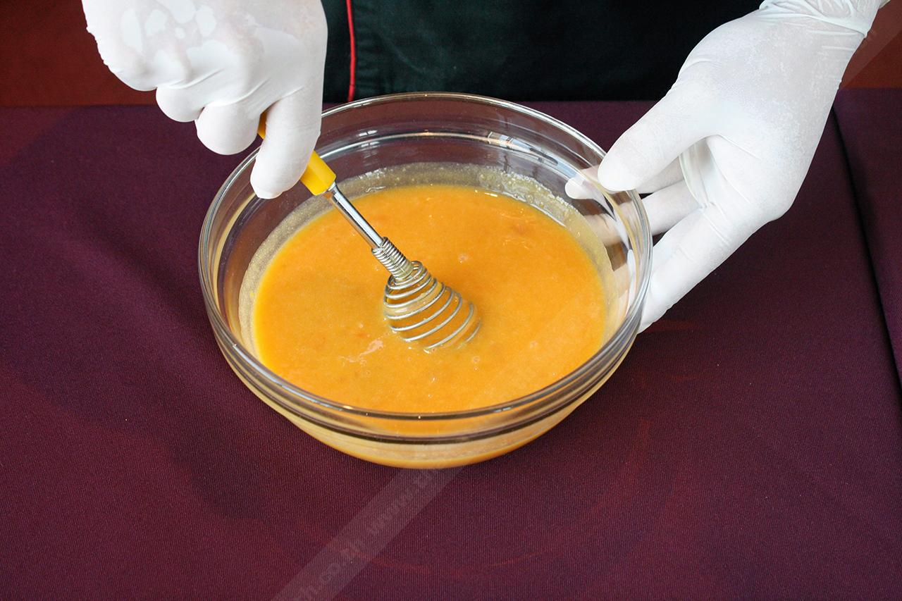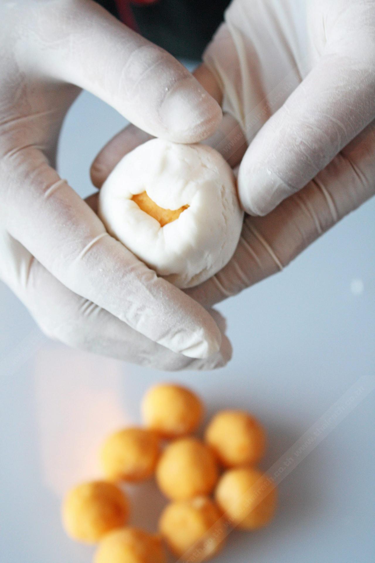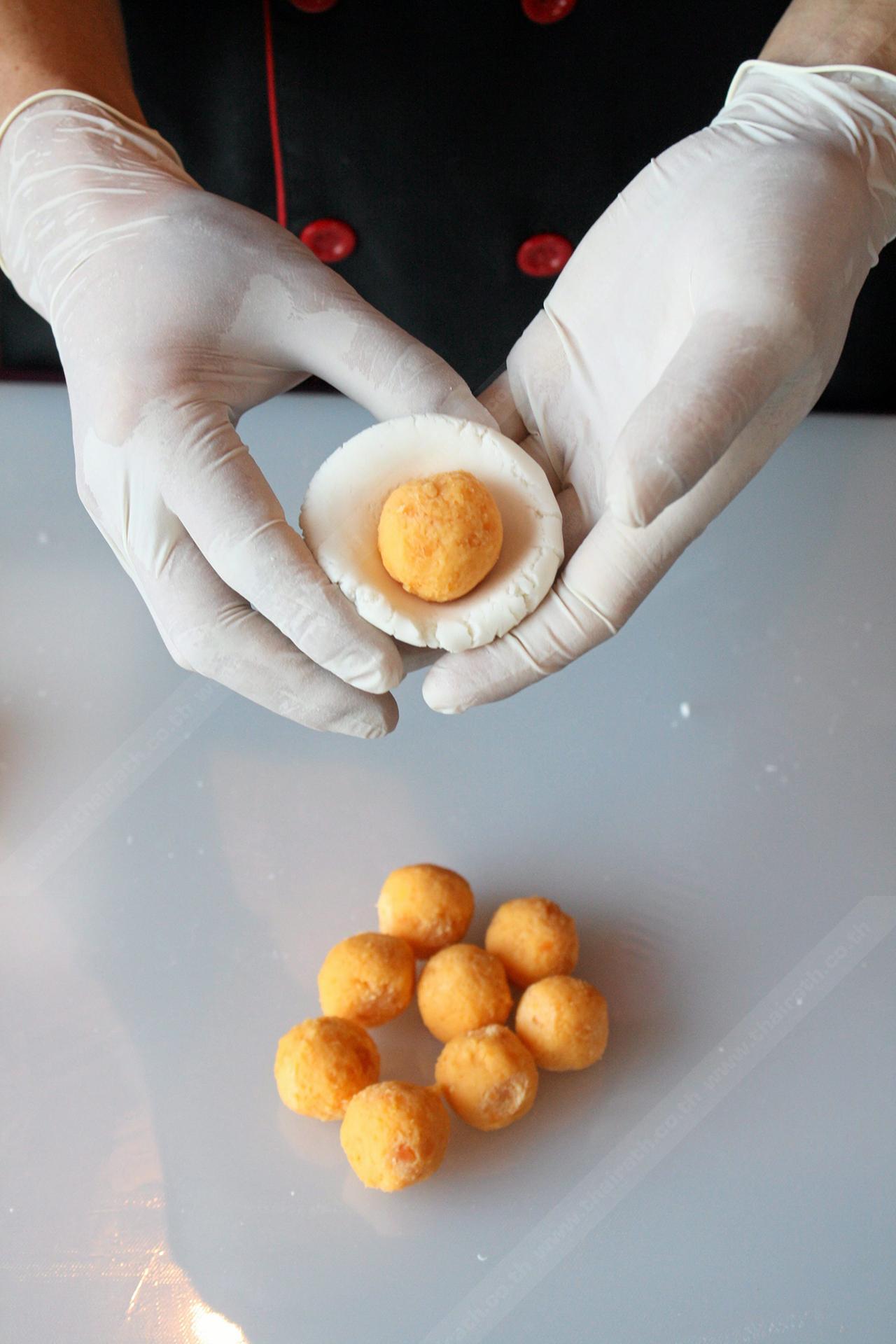 1) นำไข่แดงเค็มไปอบใช้ความร้อน 250 องศา ประมาณ 10 นาที จนสุก จากนั้นนำส่วนผสมทั้งหมดปั่นให้เข้ากัน แล้วนำไปนึ่ง 15 นาที ทิ้งให้เย็น นำไส้ที่ได้แช่ตู้เย็นเพื่อให้ไส้เช็ตตัว