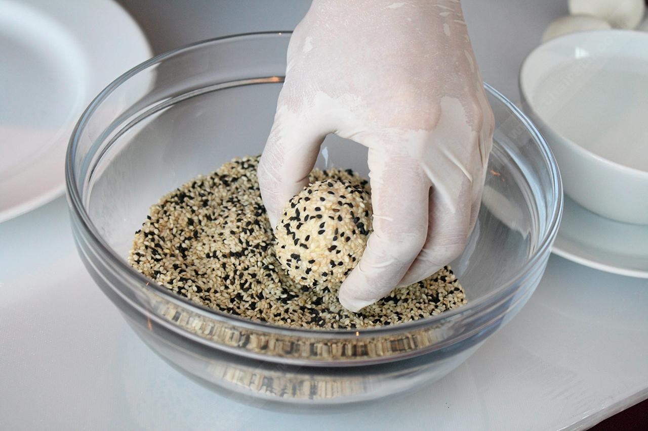 3) นำแป้งที่ได้ปั้นเป็นลูกกลมๆ ใส่ไส้ที่เตรียมไว้ ห่อแป้งปิดไส้ให้มิด ฉีดน้ำให้ทั่วแป้งพอเปียก นำไปคลุกงาดำและงาขาวจนทั่วกันทั้งลูก