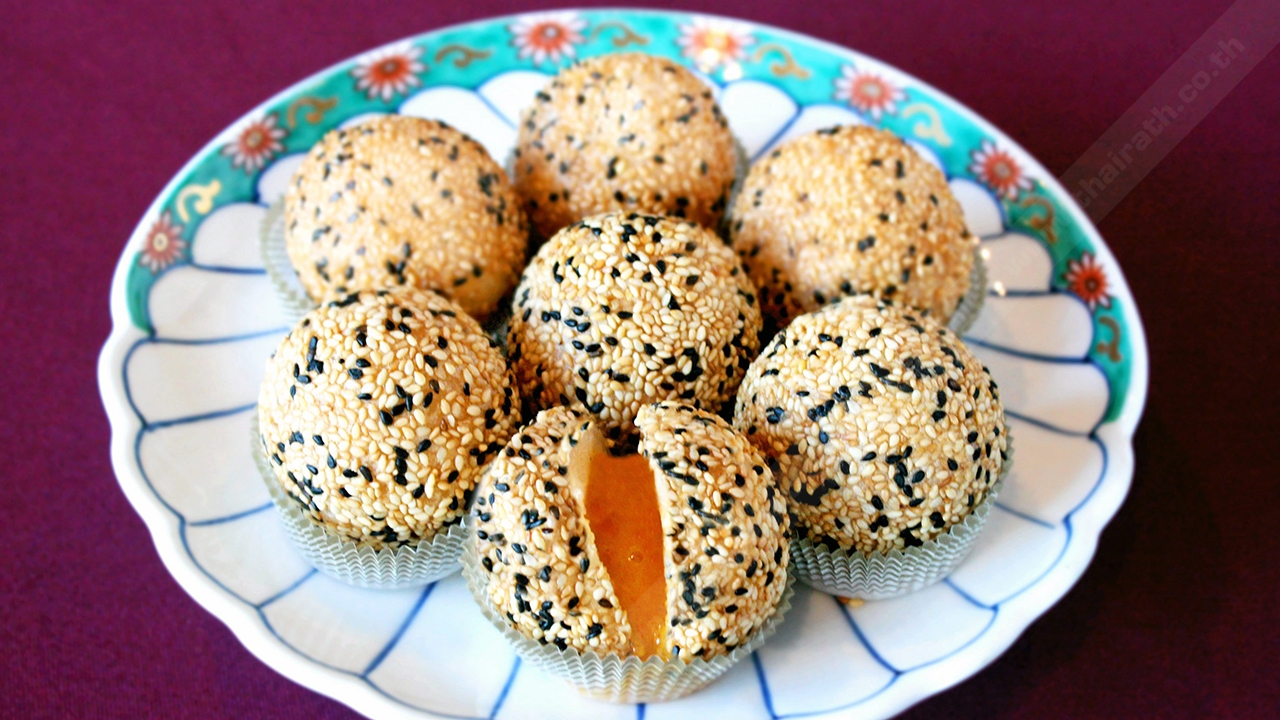 ส่วนผสมแป้ง : แป้งข้าวเหนียว 100 กรัม/ แป้งตั่งหมิ่น 38 กรัม/น้ำตาลทราย 38 กรัม/เนยขาว 19 กรัม/น้ำเปล่า19 กรัม/งาดำ 13 กรัม/ งาขาว 25 กรัม/น้ำมันพืชสำหรับทอด