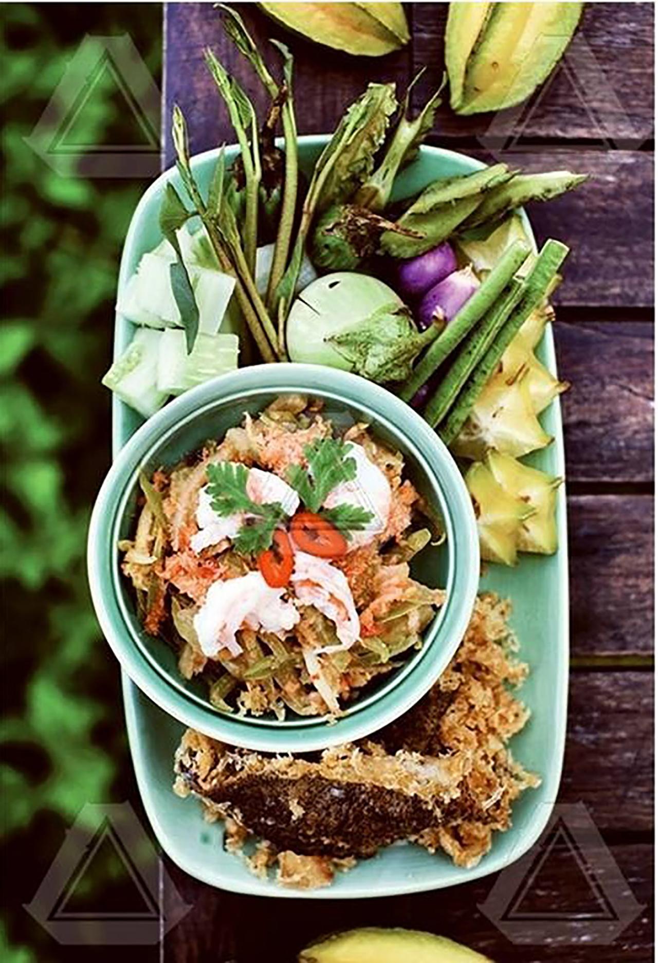 โขลกเนื้อปลาช่อนให้พอหยาบๆ ตักขึ้น โขลกกระเทียม พริกขี้หนู กะปิ ให้เข้ากัน จากนั้นใส่เนื้อปลาช่อนลงไปโขลกต่อ ผสมน้ำมะนาว น้ำปลา น้ำตาลปี๊บ คนผสมให้เข้ากันให้รสออกแหลม จากนั้นนำส่วนผสมที่โขลกไว้ลงไปคลุกให้เข้ากัน จากนั้นใส่มะเฟืองลงไป ตักใส่ถ้วย เสิร์ฟพร้อมปลากรอบปิ้งทอดกรอบหรือกุ้งแห้งทอด ผักที่ใช้แนมประกอบไปด้วย มะเขือ แตงกวา ถั่วพู ช่อมะกอก หรือจะใช้ผักเผา เช่น บวบ น้ำเต้า มะระ กระเจี๊ยบ และหน่อไม้ จาก สามพรานริเวอร์ไซด์