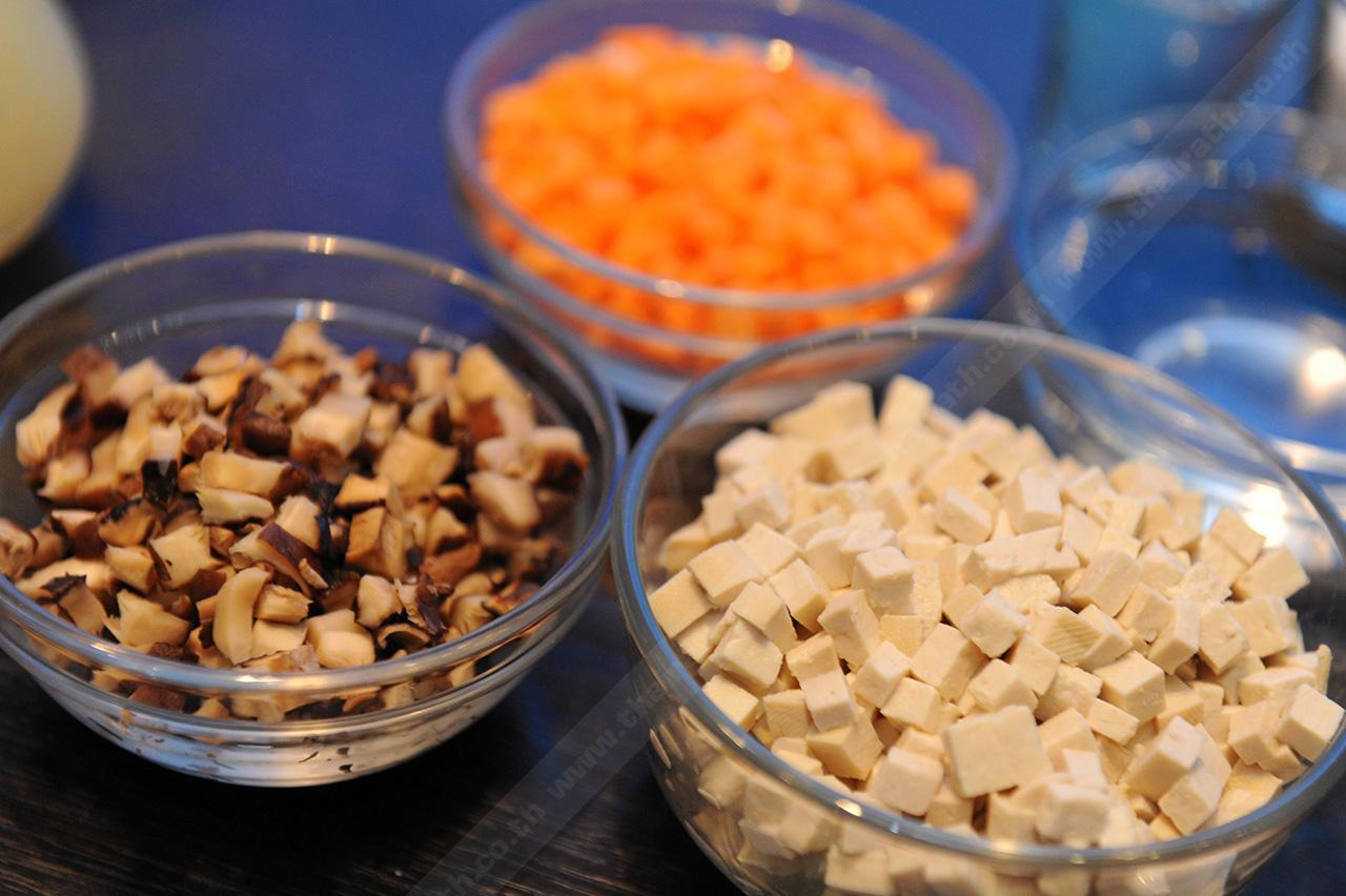 ส่วนผสม (สำหรับ 5 ที่) : เต้าหู้แข็ง ½ แผ่น/เห็ดหอมแห้งแช่น้ำหั่นเป็นชิ้นเล็กๆ 3 ชต./แครอทหั่นชิ้นลูกเต๋าเล็กๆ 2 ชต./ซอสปรุงอาหารตราแม็กกี้ 3 ชต. (30 กรัม)/น้ำตาลทราย 2 ชช./น้ำเปล่า ½ ถ้วยตวง/น้ำมันพืช 1 ชต./เส้นหมี่ข้าวกล้องลวกสุก 4 ถ้วยตวง/เห็ดนางฟ้าแดดเดียว ½ ถ้วยตวง/แตงล้านหั่นเป็นชิ้นสี่เหลี่ยมลูกเต๋าเล็กๆ 1 ลูก/ผักสลัด (บัตเตอร์เฮด), ผักชีฝรั่ง, ใบสะระแหน่ตามชอบ