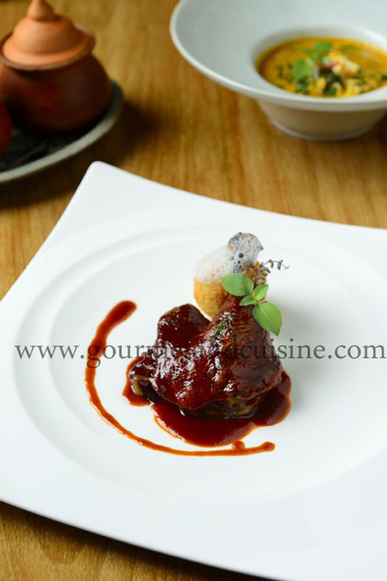จานต่อมาก็แอบซ่อนความเป็นไทยได้น่าสนใจ ผัดพริกขิงน่องเป็ด เชฟชุมพลนำน่องเป็ดไปซูสวิดนาน 12 ชั่วโมง แล้วทอดก่อนผัดกับพริกขิง เนื้อเป็ดกรอบนอก เนื้อร่อนไม่แห้ง กินกับข้าวหุงกะทิชุบมะพร้าวขูดแล้วทอด คล้ายข้าวจี่แต่หอมมะพร้าว