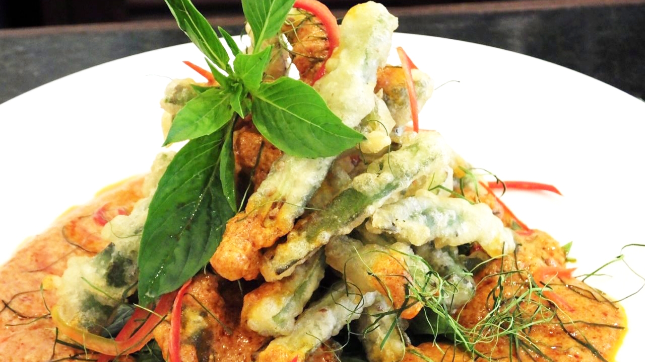 พอดีช่วงนี้อยู่ระหว่างทานเจอีกรอบ เลยขอนำเสนอเมนูมังสวิรัติ “ฉู่ฉี่กระเจี๊ยบทอดกรอบ” ซึ่งอาจจะดัดแปลงเป็นเมนูเจก็ได้ โดยปรับเปลี่ยนไปใช้เครื่องแกงเจแทน เมนูนี้ง่ายต่อการปรุง และเต็ม ไปด้วยคุณค่าทางอาหาร ซึ่งรังสรรค์ขึ้นโดย คุณนูรอ โซ๊ะมณี สเต๊ปเป้ เจ้าของภัตตาคาร บลู เอเลเฟ่นท์ ที่มีสาขาอยู่ทั่วโลกกว่า 11 สาขา