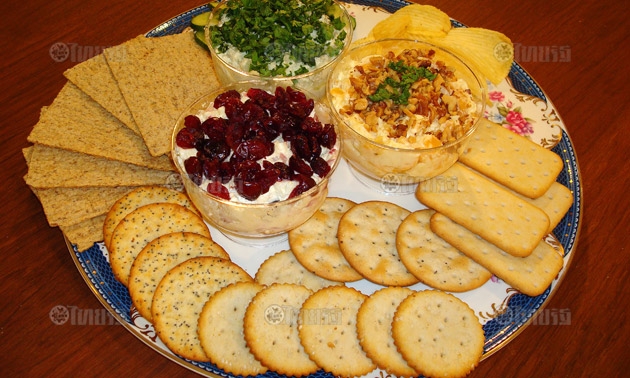 ส่วนผสม : เนยสดที่อุณหภูมิห้อง 1/2 ถ้วย/ครีมชีส 225 กรัม/น้ำมะนาว 2 ชต./ซอสทาบัสโก 5 หยด/ ซอส Worcestershire 1/2 ชช./เกลือ 1/2 ชช./พริกไทยขาวบุบใหม่ๆ 1/4 ชช./ เนยแข็งเชดดาขูด 225 กรัม/ชัดนี่ 2 ชต./แคลนเบอรี่แห้งสับละเอียด 3/4 ถ้วย/เนยแข็ง Roquefort 170 กรัม/ หอมแดงสับละ-เอียด 1 ชต./ บรั่นดี 2 ชช./ วอลนัทอบสับหยาบ 1 ถ้วย/เนยแข็งจากนมแพะ 225 กรัม/ต้นหอมซอยละเอียด 2 ชต./ใบพาสลี่สับละเอียด 1/3 ถ้วย/แตงกวาหั่นเป็นแว่นบางๆ 1 ผล/ข้าวเกรียบชนิดต่างๆ/วอเตอร์แครกเกอร์