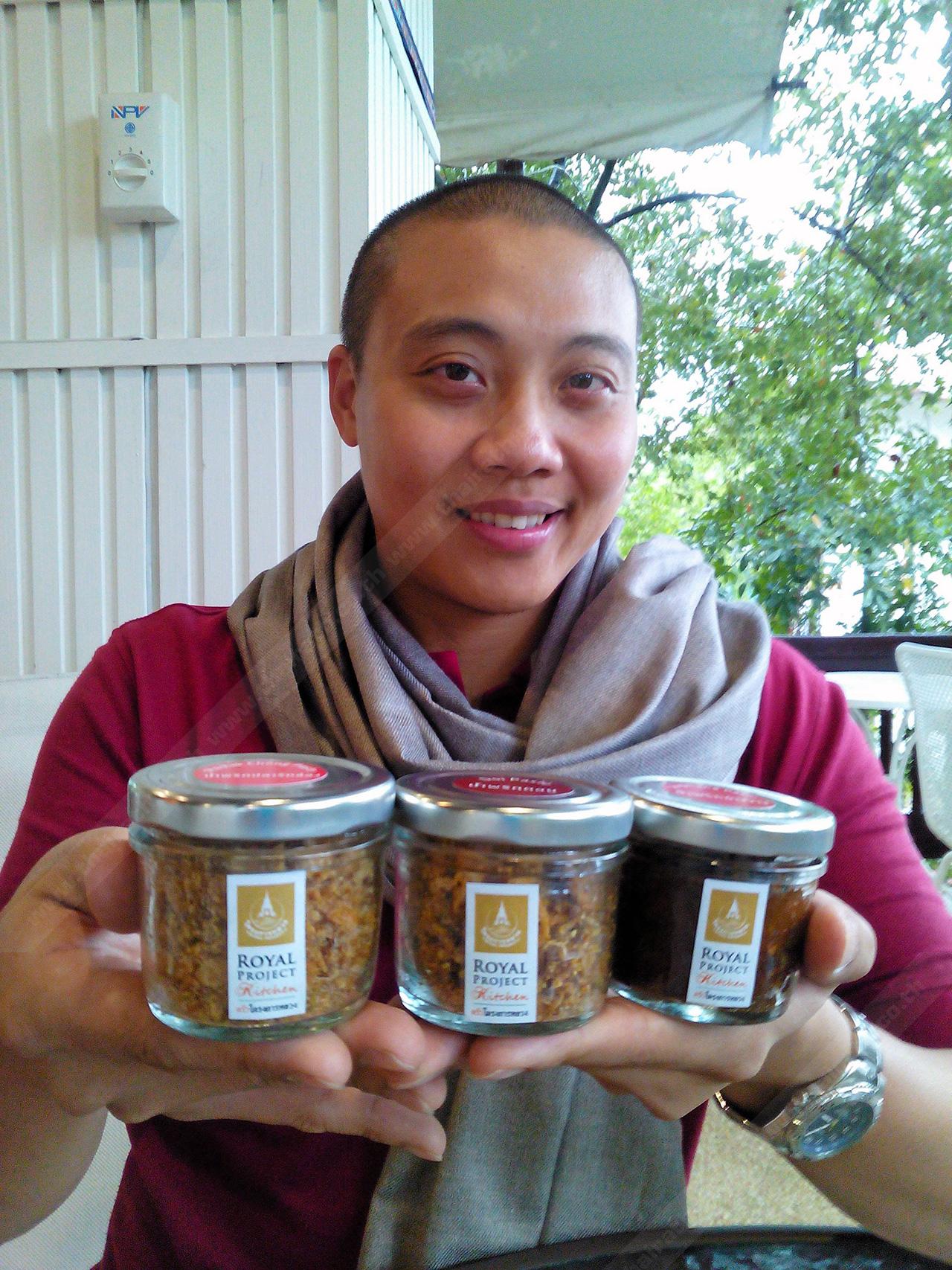 หัวหน้าโครงการร้านครัวโครงการหลวง จารุทัศ สนิทวงศ์ ณ อยุธยา เผยว่า น้ำพริกทั้ง 3 เมนูที่ขึ้นชื่อจากโครงการหลวงอ่างขาง นำมาให้ลิ้มลอง มีต้นตำรับมาจากฝั่งพม่าแทบทั้งสิ้น เป็นอิทธิพลการกินน้ำพริกของกลุ่มชาติพันธุ์ชาวไทยใหญ่ จากรัฐฉาน ที่อพยพเข้ามาอยู่ในพื้นที่แถบดอยอ่างขาง เครื่องปรุงของน้ำพริกทั้ง 3 ชนิดนี้ ไม่ใช่กะปิ ไม่ใช่ปลาร้า แต่เป็นถั่วเน่า หรือถั่วเหลืองหมัก ที่นิยมรับประทานในแถบวัฒนธรรมล้านนา รวมไปถึงชาวปกาเกอะญอด้วย ความพิเศษของ “น้ำพริกดอย” เป็นน้ำพริกแห้ง เก็บไว้ได้นาน มีส่วนผสมของถั่วเน่าปิ้งหั่นเป็นชิ้นๆ หอมทอด กระเทียมทอด พริกแห้งซอย และกุ้งแห้ง โดยนำมาคั่วรวมกันแล้วปรุงรสชาติด้วยเกลือเท่านั้น ส่วน “น้ำพริกอ่างขาง” เดิมทีชาวไทยใหญ่จะเรียกน้ำพริกอุ๊บ ซึ่งการอุ๊บ คือการนำมาต้มแบบเคี่ยวคล้ายสตูว์ เลยเป็นน้ำพริกที่มีลักษณะหมาดๆ เก็บไว้ได้นาน ทำจากวัตถุดิบแบบเดียวกับน้ำพริกดอย แต่จะใส่มะเขือเทศเข้าไปด้วย และน้ำพริกปลั๊กฉ่อง หรือ “น้ำพริกปลารักฉ่อง” เป็นน้ำพริกแบบพม่าที่ชาวไทยใหญ่นิยมรับประทาน น้ำพริกชนิดนี้ไม่มีถั่วเน่า แต่ใช้ปลาเค็มแห้งเป็นเครื่องปรุงแทน โดยเอามาต้ม แล้วยี นำไปทอดจนฟู จากนั้นมาผัดรวมกับหอมและกระเทียมไทยที่ทอด แล้วใส่กุ้งแห้งและพริกแห้ง ปรุงด้วยเกลือ.