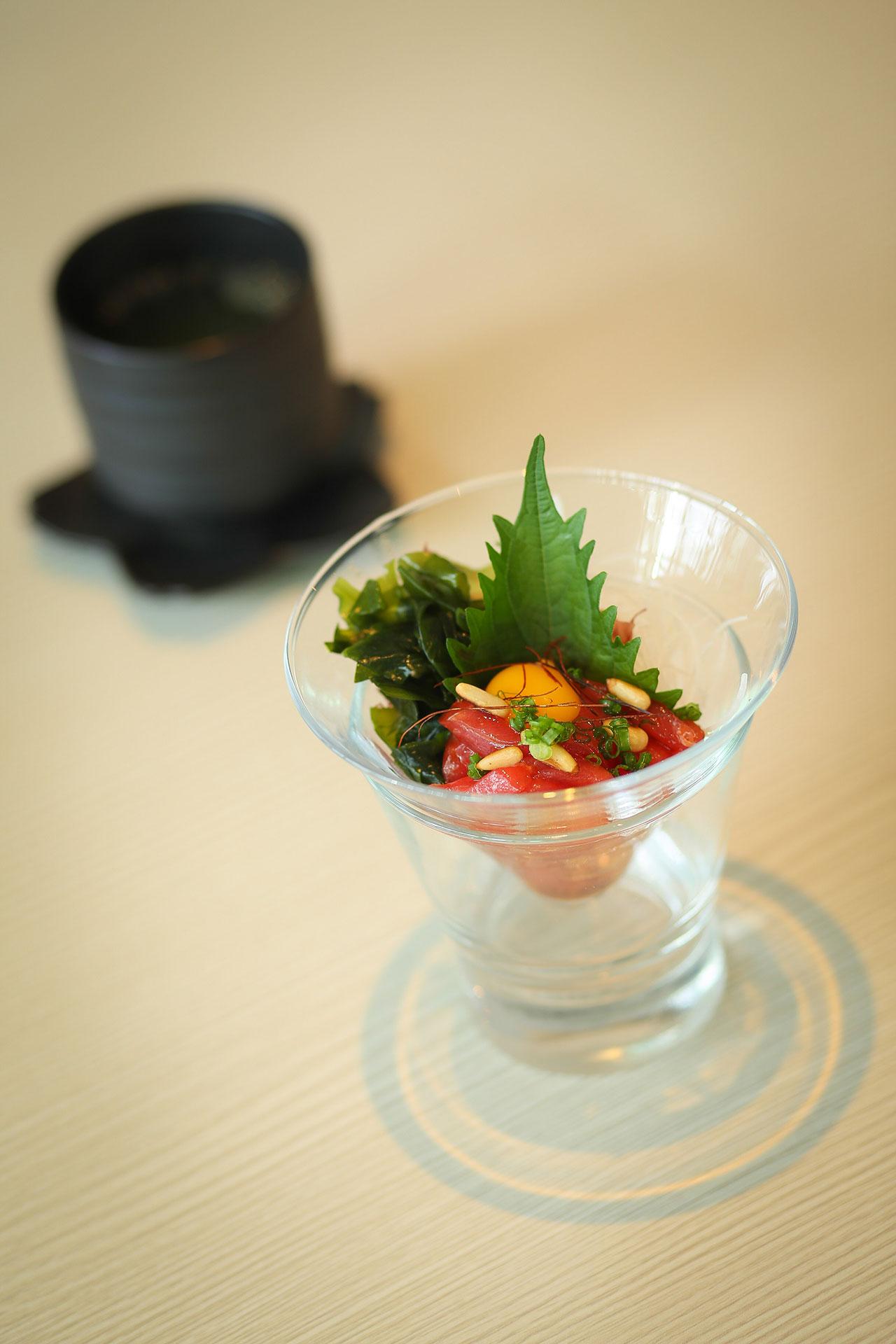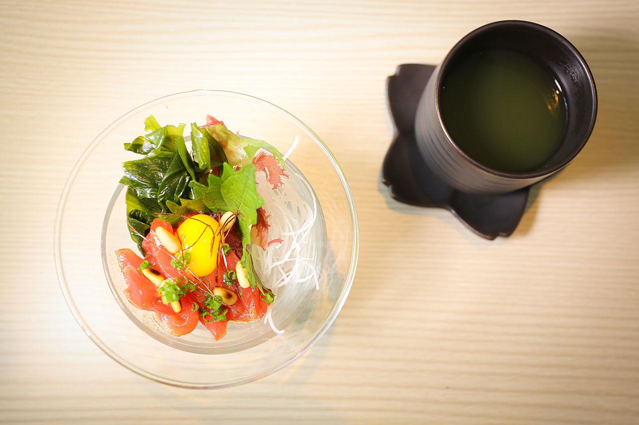 ยำทูน่าสไตล์ญี่ปุ่น เมนูนี้เป็นอีกหนึ่งที่แนะนำ โดยการนำเนื้อส่วนอากามิของปลาสไลด์พอดีคำ นำมาผสมในสูตรของทางร้าน โดยมีไข่นกกระทาเอาไว้ข้างบนนิดหน่อย ก่อนกินก็คนให้เข้ากันก็ได้รสชาติเค็มๆ นิดๆ เพราะมีความมันของไข่แดง อร่อยแปลกดีเหมือนกัน