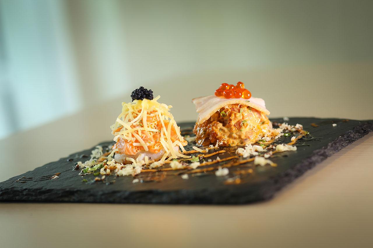 คนที่ชอบหอยเชลล์เชิญมาทางนี้ เมนูนี้คัดสรรหอยเชลล์ตัวโต เอาไปนาบบนกระทะ แต่อย่าให้สุกมากเกินไป เพราจะทำให้หอยเชลล์ไม่หอมและแข็งจนเกินไป โดยเขาจัดแต่งเป็น 2 แบบในจานเดียว หอยตัวแรกแต่งหน้าด้วยแซลมอน ส่วนอีกตัวเป็นหน้าสไปซี่ทูน่า ชีสพร้อมกับปิดท้านด้วยการโรยคาเวียร์ แฮ่ม การทำคาเวียร์ที่นี่ก็มีเคล็ดลับที่ทำให้ไม่คาวด้วยการเหยาะวอสก้าลงไปเพื่อดับคาว