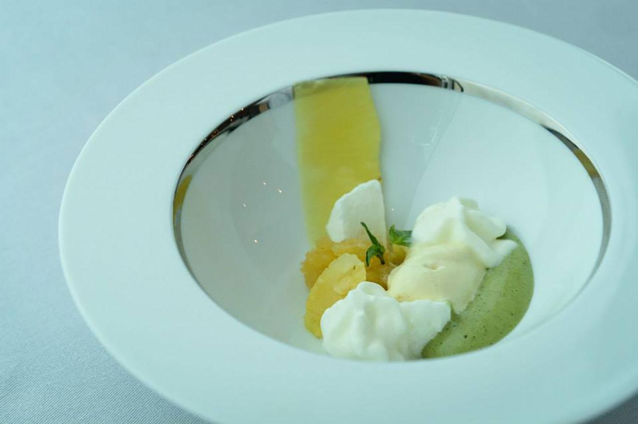 ล้างปากด้วยกรานิตาเบอร์รีและโยเกิร์ต ก่อนปิดท้ายด้วย Soufflé ซูเฟล่วานิลลารสหวาน ตัดกับสับปะรดมาริเนต โฟมสับปะรด ซาบายองโหระพา และไอศกรีมวานิลลา แล้วเชฟยังเสิร์ฟของหวานชิ้นเล็กและลิเคียวร์โฮมเมดตบท้ายอีกด้วย