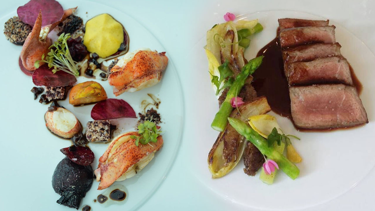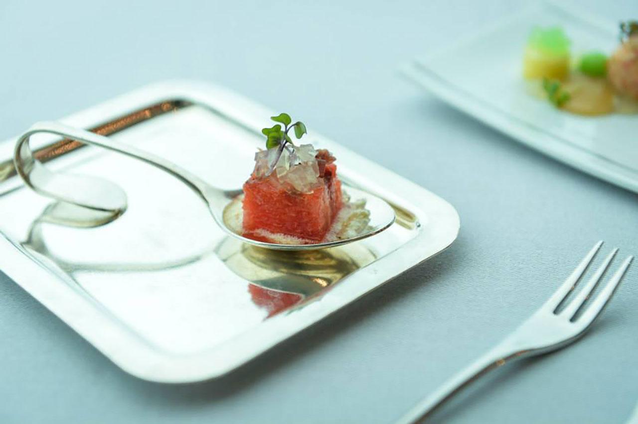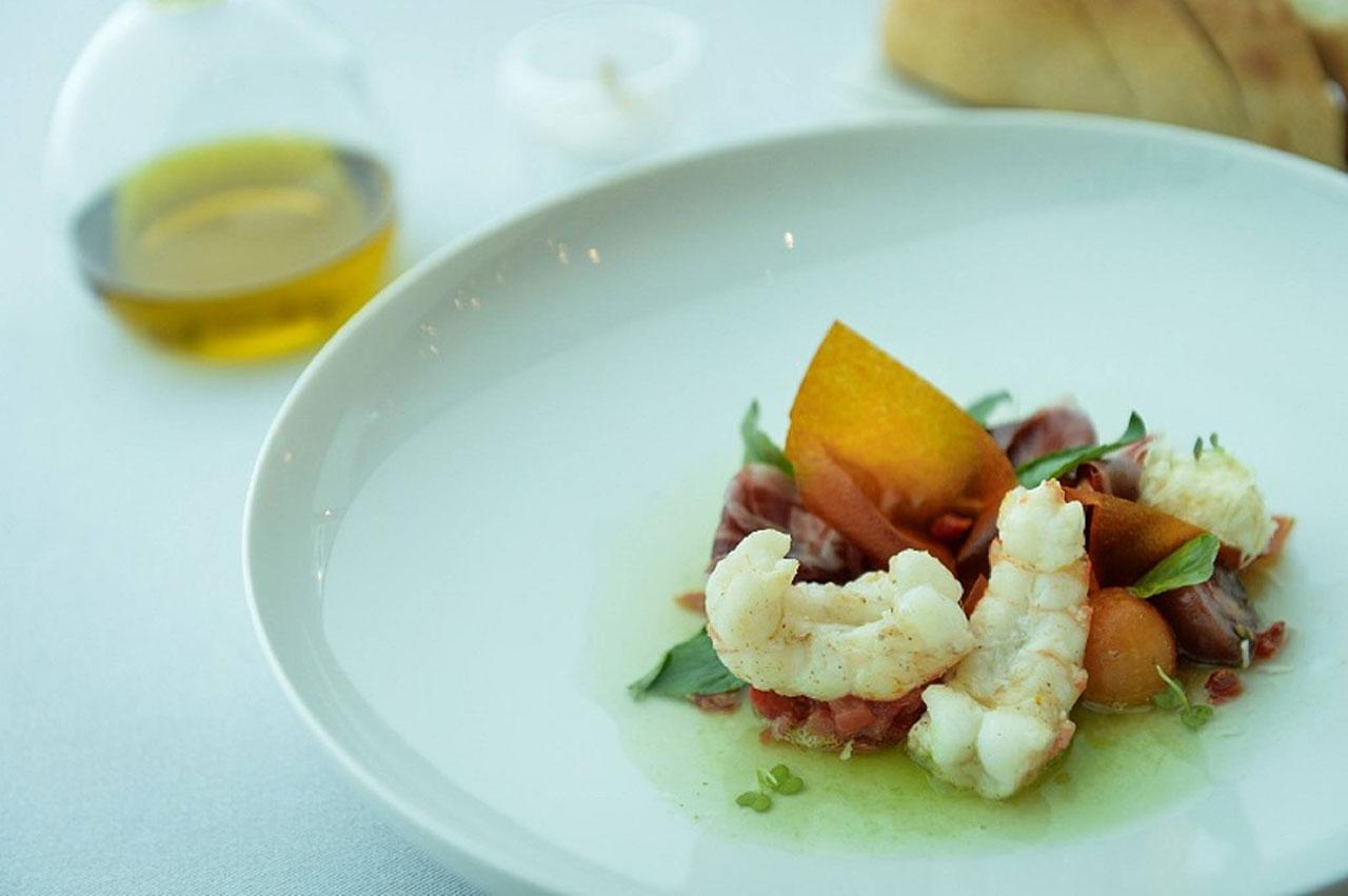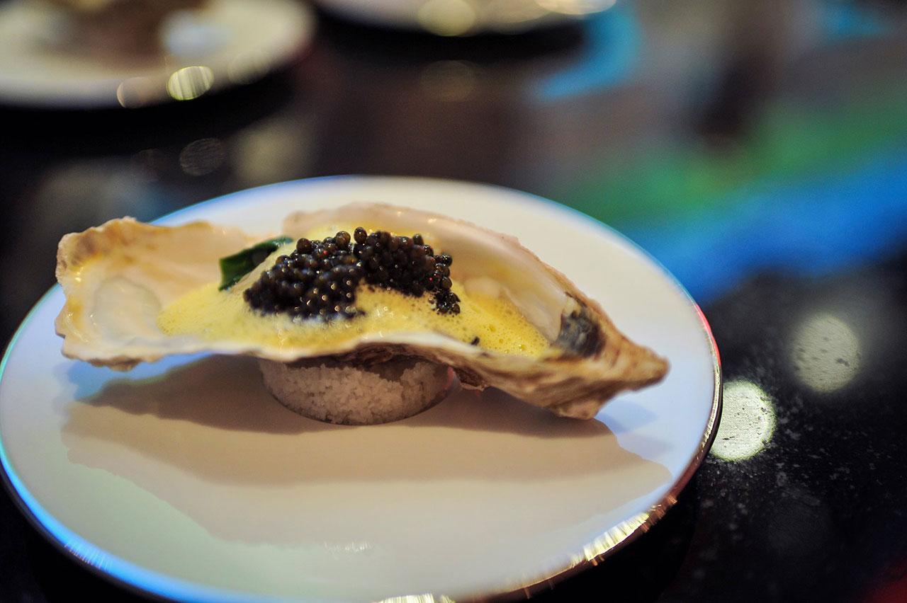เริ่มกันที่อาหารเรียกน้ำย่อย Faberge & Caviar คาเวียร์บนแครมบรูเลในเปลือกไข่ รสออกเค็ม กินคู่กับบรินี หัวหอม สแคมเบิลเอกซ์ มันฝรั่ง และโฟมมันฝรั่ง รสเปรี้ยวหวานตัดเค็มของคาเวียร์ อีกจานเป็น Pork, Gamba & Black Truffle หมูกรอบนาบบนกระทะ นุ่มอร่อย กับกุ้งแกมบาเนื้อกรอบหวาน หอมเนย ราดด้วยซอสทรัฟเฟิล