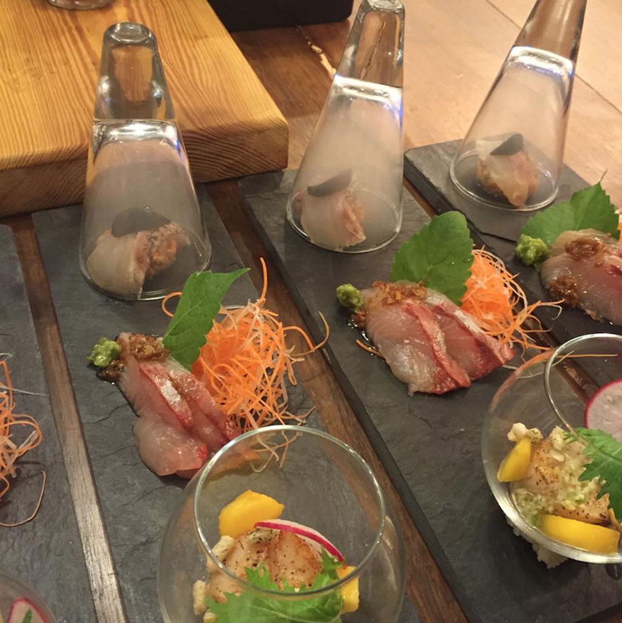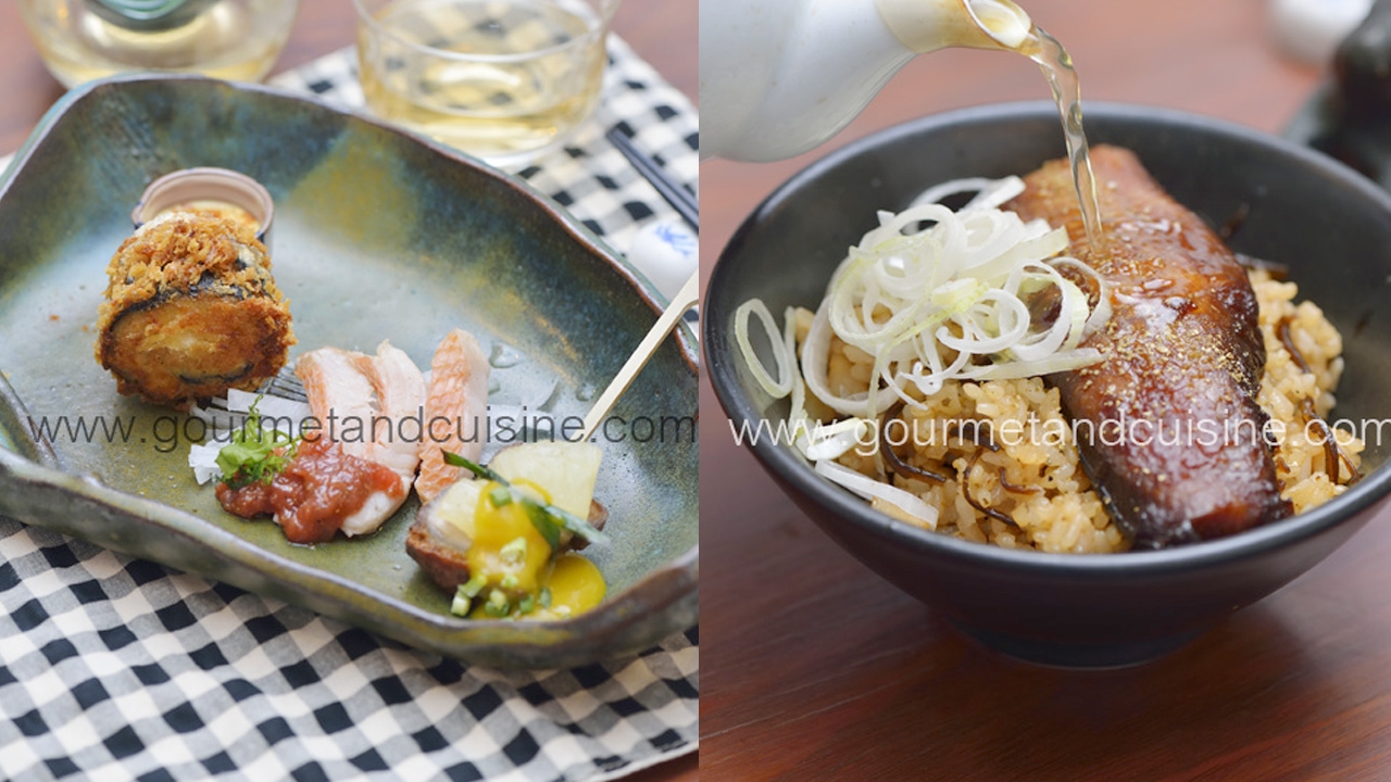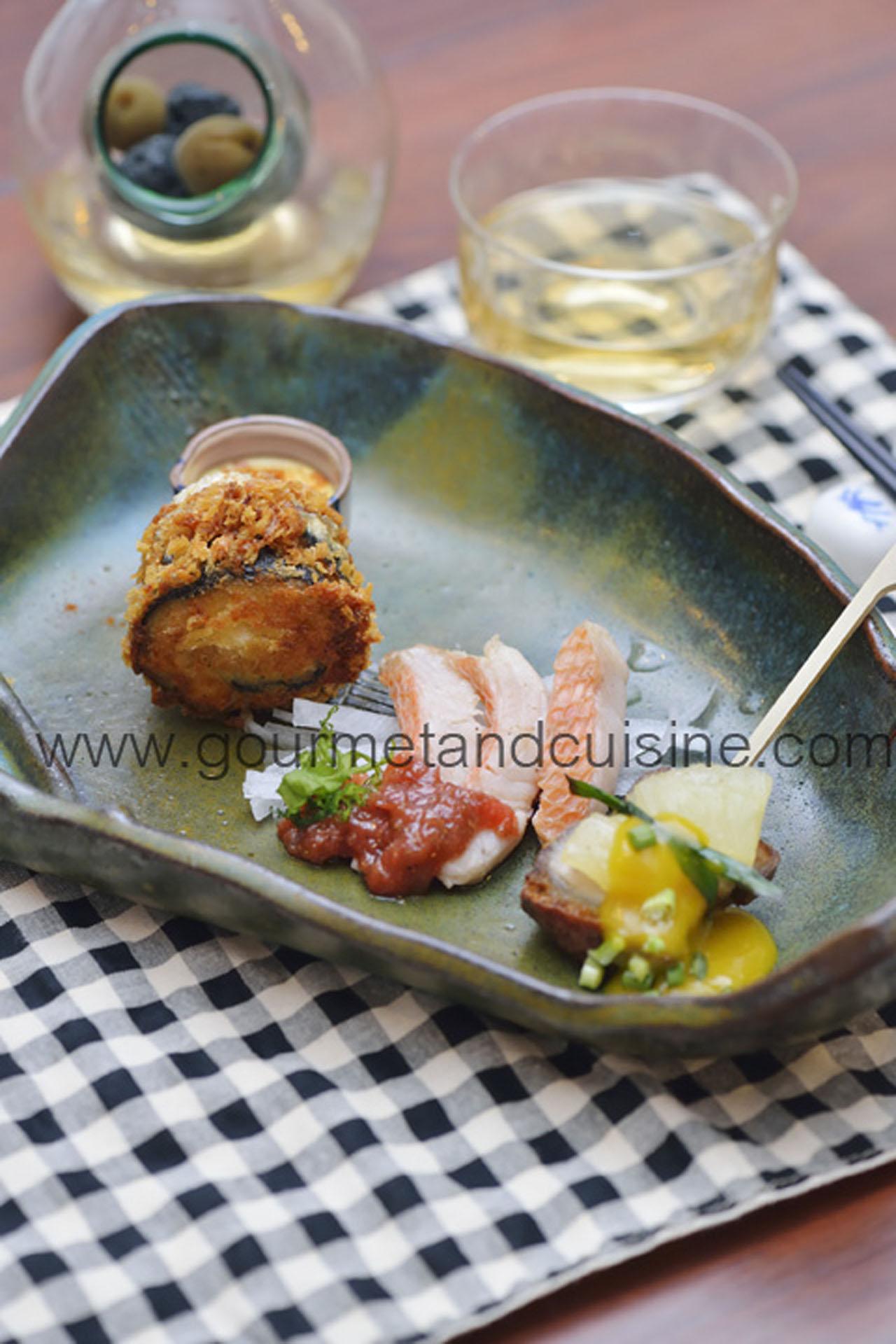 มื้อนี้เชฟจัดเป็น ไคเซกิ 11 คอร์ส เน้นรสชาติญี่ปุ่นดั้งเดิม เริ่มประสบการณ์ที่เหล้าบ๊วยดองเอง หรือน้ำเปล่าใส่หินภูเขาไฟฟูจิให้กลายเป็นน้ำแร่ตามธรรมชาติ อาหารเรียกน้ำย่อย 3 อย่าง เสิร์ฟมาในจานเดียวกัน ปลาคินเมไดนึ่งซอสบ๊วย ปลาซัมมะห่อไข่นกกระทาทอดกับซอสมะม่วงวาซาบิ และหมูอบกรอบย่างสับปะรด