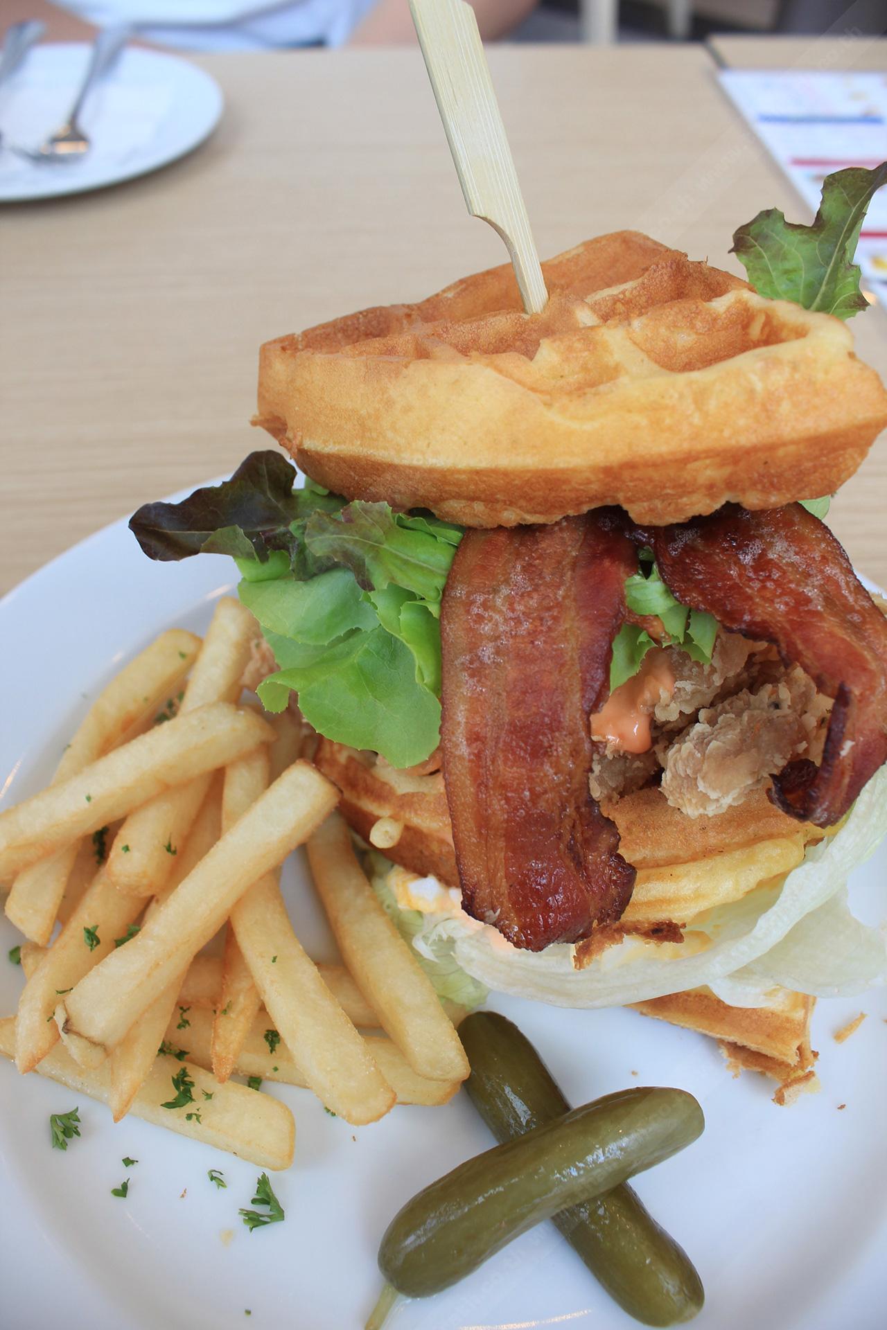 ทดสอบ : ตัวนี้จะคล้ายๆ กับแฮมเบอร์เกอร์ แต่เปลี่ยนจากเบอร์เกอร์บันเป็นวอฟเฟิลแทน ไก่ที่ใช้จะเป็นสะโพกไก่ ปกติวอฟเฟิลจะเป็นของหวานแต่ผสมผสานเข้าด้วยกันให้เป็นเหมือนแฮมเบอร์เกอร์ซึ่งมันก็ลงตัวมากๆ