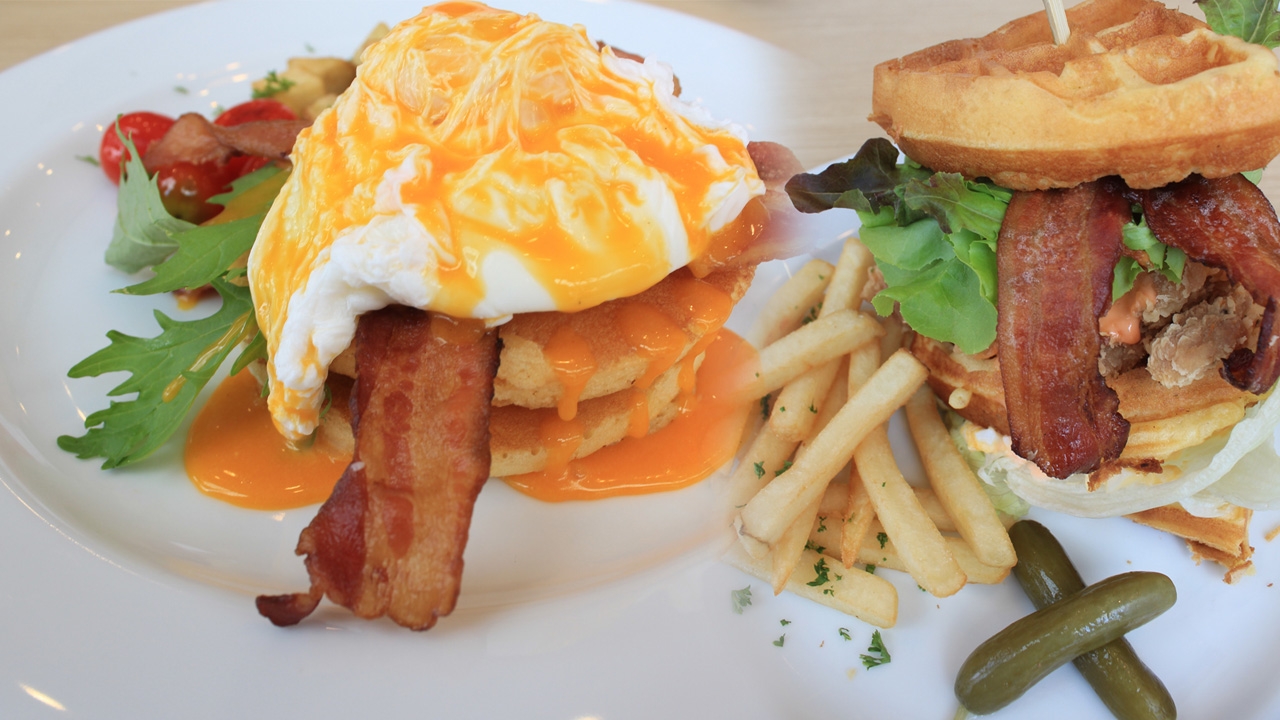 ทดสอบ : ใช้ซอสที่คิดค้นขึ้นมาเป็นสูตรของทางร้าน และก็จะมีสลัดไข่บดเป็นสูตรเฉพาะของทางร้านเช่นกัน ไข่เบเนดิกต์จะเหมือนไข่ดาวน้ำ และมีเบคอน มีแพนเค้ก ซึ่งแพนเค้กที่น่าจะเป็นของหวานแต่มันก็เข้ากันได้อย่างลงตัว
