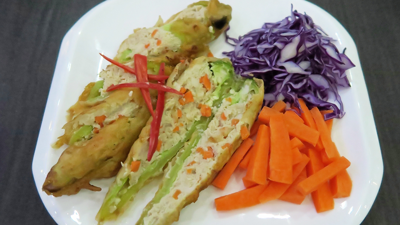 เครื่องปรุง : เนื้อไก่บด 3 ขีด/รากผักชี / แครอทหั่นลูกเต๋าเล็กๆ/พริกไทย/ซีอิ๊วขาว/น้ำมันหอย/น้ำปลา/พริกหยวกเม็ดโต เนื้อแข็ง สดใหม่/ แป้งทอดกรอบ/น้ำเย็น...วิธีทำ 1) เตรียมพริก หยวก โดยการนำมาผ่ากลางเพียงด้านเดียว อย่าให้ตัวพริกขาดออกจากกัน แคะไส้กลางและเม็ดออกให้หมด 2) นำเนื้อไก่บดมาผสมกับรากผักชีโขลก แครอทหั่นลูกเต๋าเล็กๆ ปรุงรสด้วยพริกไทย ซีอิ๊วขาว น้ำมันหอย น้ำปลา ตามใจชอบว่าต้องการความเข้มข้นมากน้อยเพียงใด แล้วยัดใส่ในพริกหยวกให้เต็มสวยงาม 3) เตรียมซึ้งหรือลังถึง พอน้ำเดือด ลดไฟระดับกลางเรียงพริกที่เตรียมไว้ในลังถึง นึ่งพอสุกประมาณ 80 เปอร์เซ็นต์ นำขึ้นพักไว้ให้เย็น 4) ผสมแป้งทอดกรอบกับน้ำเย็นตามสัดส่วนข้างฉลาก 5) ตั้งกระทะ ใส่น้ำมัน พอร้อนได้ที่ นำพริกยัดไส้ชุบแป้งลงทอด ความหนาบางของแป้งแล้วแต่ความชอบ ทอดจนออกสีเหลืองทองสวย ตักขึ้นซับน้ำมัน พร้อมเสิร์ฟได้เลย