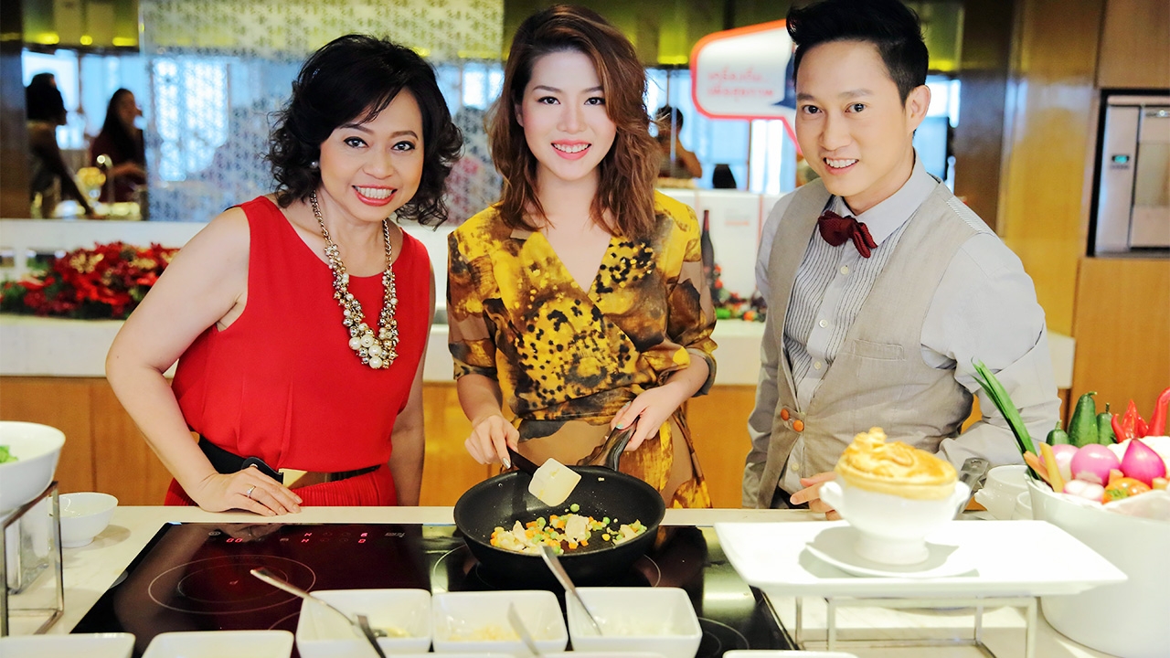 สุชาดา ธีรวชิรกุล และ ภก.ดร.พงศกรพัฒน์ อรุโณทยานันท์ จากยูนิลีเวอร์ เน็ทเวิร์ค ดูการทำชิคเก้น พอท พาย ของปรัชญมน บุรณศิริ.