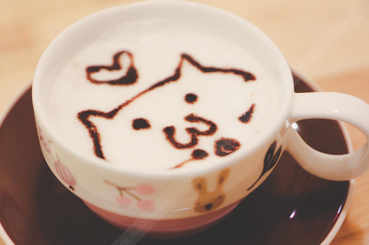 ส่วนเมนูแนะนำ เริ่มจาก กาแฟคาปูชิโน่ มีฟองนมขาวฟูฟ่องด้านบน เวลาเสิร์ฟน้องเมดก็จะมาวาดลาเต้อาร์ตเป็นตัวการ์ตูนต่างๆ ในถ้วยกาแฟให้ลูกค้าแบบสดๆ ที่โต๊ะกันเลย