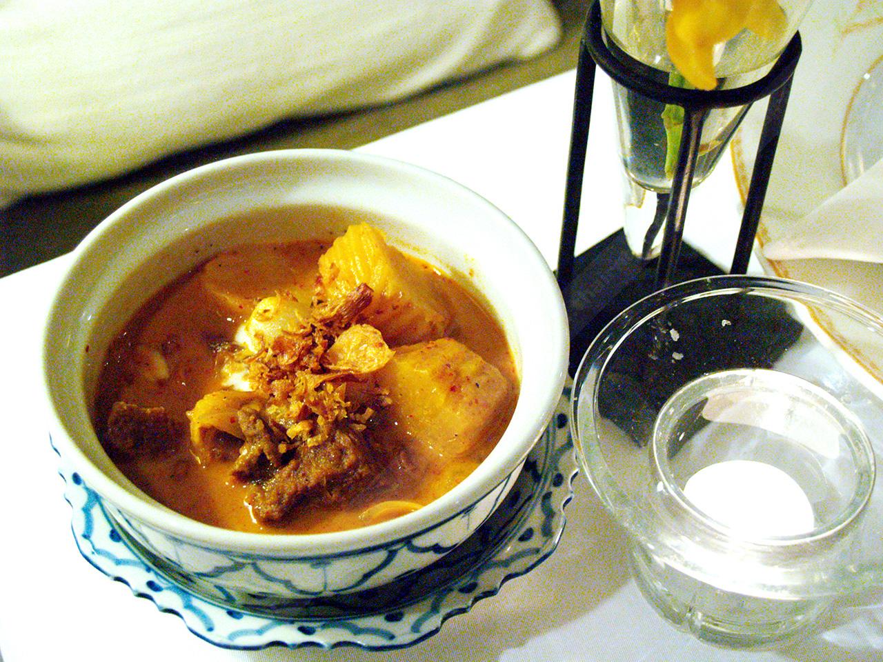 เป็นเมนูที่สร้างชื่อให้ประเทศไทยเลยทีเดียว เพราะชาวต่างชาติต่างยอมรับในรสชาติของมัสมั่นที่หอม อร่อย กลมกล่อม สำหรับห้องอาหารแห่งนี้จะเสิร์ฟเป็นมัสมั่นเนื้อ ที่ใช้เนื้อคุณภาพเคี่ยวมาอย่างดีจนเนื้อนุ่ม เข้ากับเครื่องแกงมัสมั่นหอมๆ อร่อยฟินอีกจาน