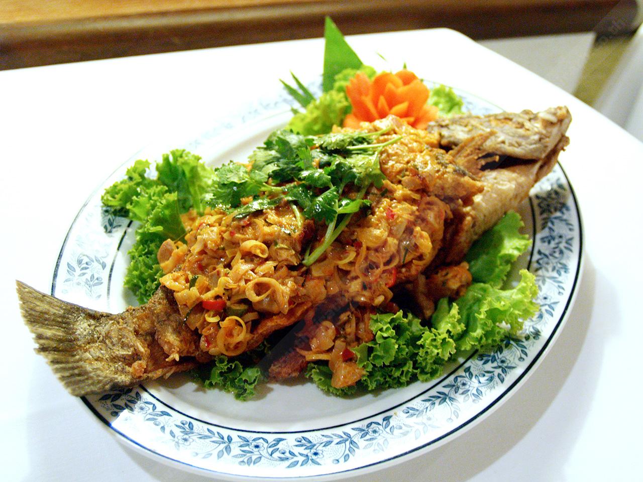 ปลากะพงไซส์บิ๊ก นำมาทอดจนเหลืองกรอบ จากนั้นนำซอสต้มยำมาราดจนทั่วตัวปลา เหมือนลักษณะของปลาทอดลุยสวน เพียงแต่เปลี่ยนซอสเป็นแบบต้มยำ ครบรสทั้งเปรี้ยว เผ็ด เค็ม ติดหวานเพียงเล็กน้อย รสชาติแซ่บถูกใจคนไทยแน่นอน
