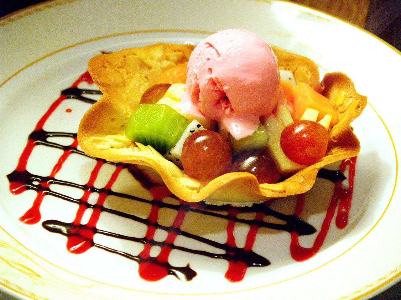 สลัดผลไม้สดเสิร์ฟพร้อมแป้งกระทงกรอบๆ และเพิ่มไอศกรีม 1 สคูปที่ด้านบน