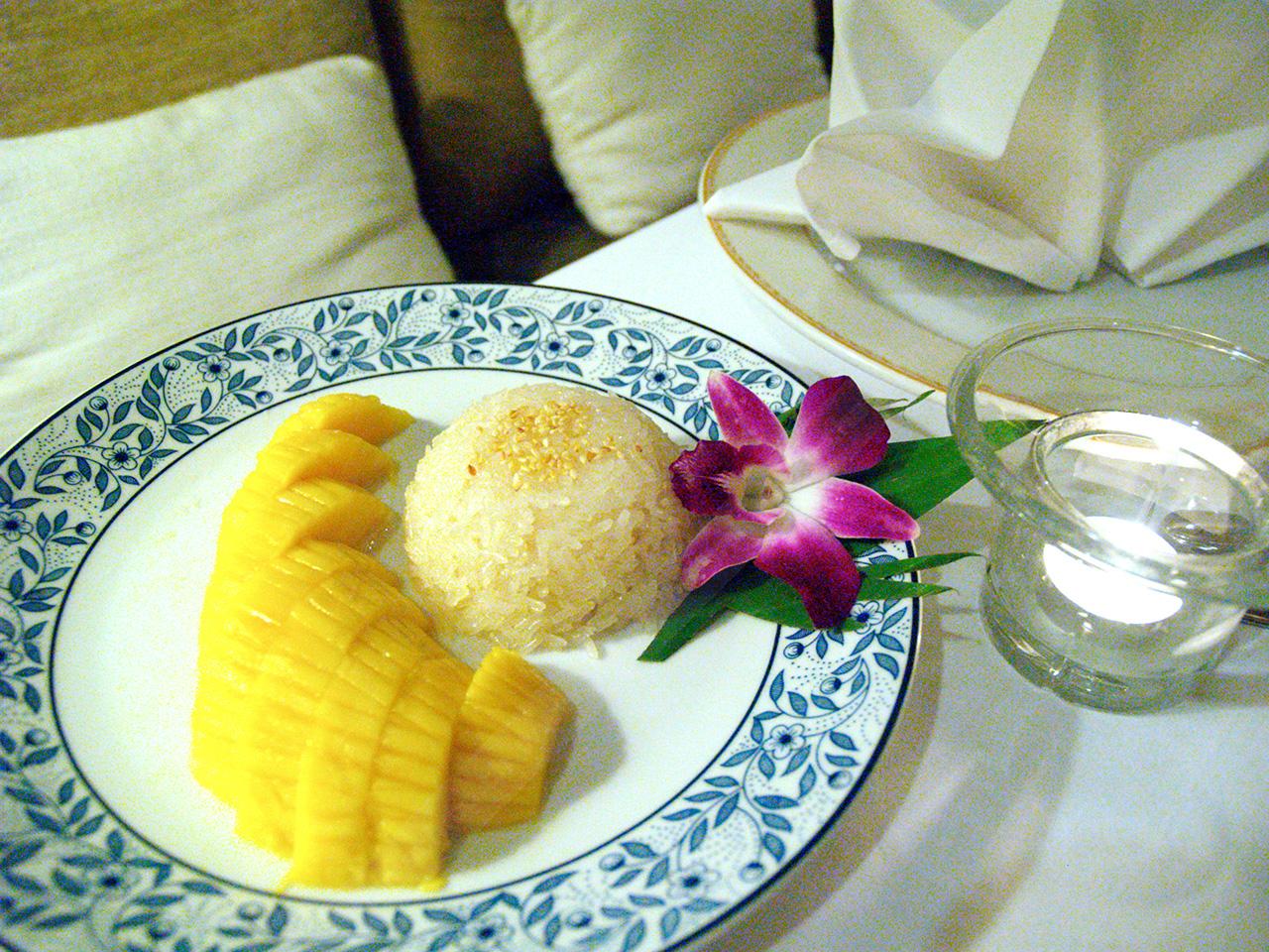 ปิดท้ายด้วยเมนูของหวาน ที่โด่งดังไปไกลถึงต่างแดนอีกเช่นกัน นั่นคือ ข้าวเหนียวมะม่วง หรือ Sticky rice with ripe mangoes หอมหวาน สดชื่น เป็นเมนูปิดท้ายมื้อเย็นแบบไทยๆ ได้อย่างยอดเยี่ยม