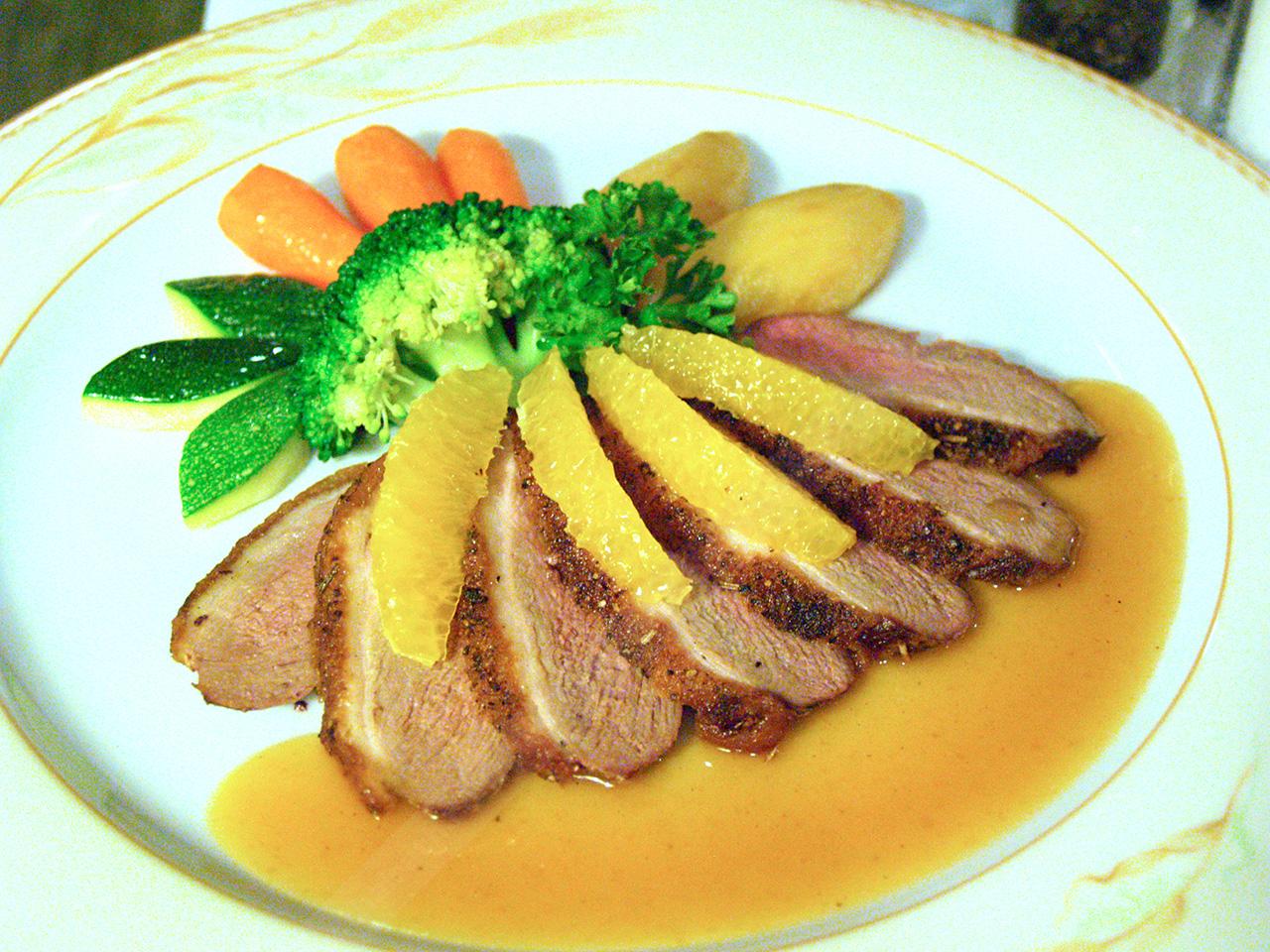 เมนูนี้คืออกเป็ดย่าง เสิร์ฟพร้อมกับซอสส้มและเนื้อส้มฉ่ำลิ้น