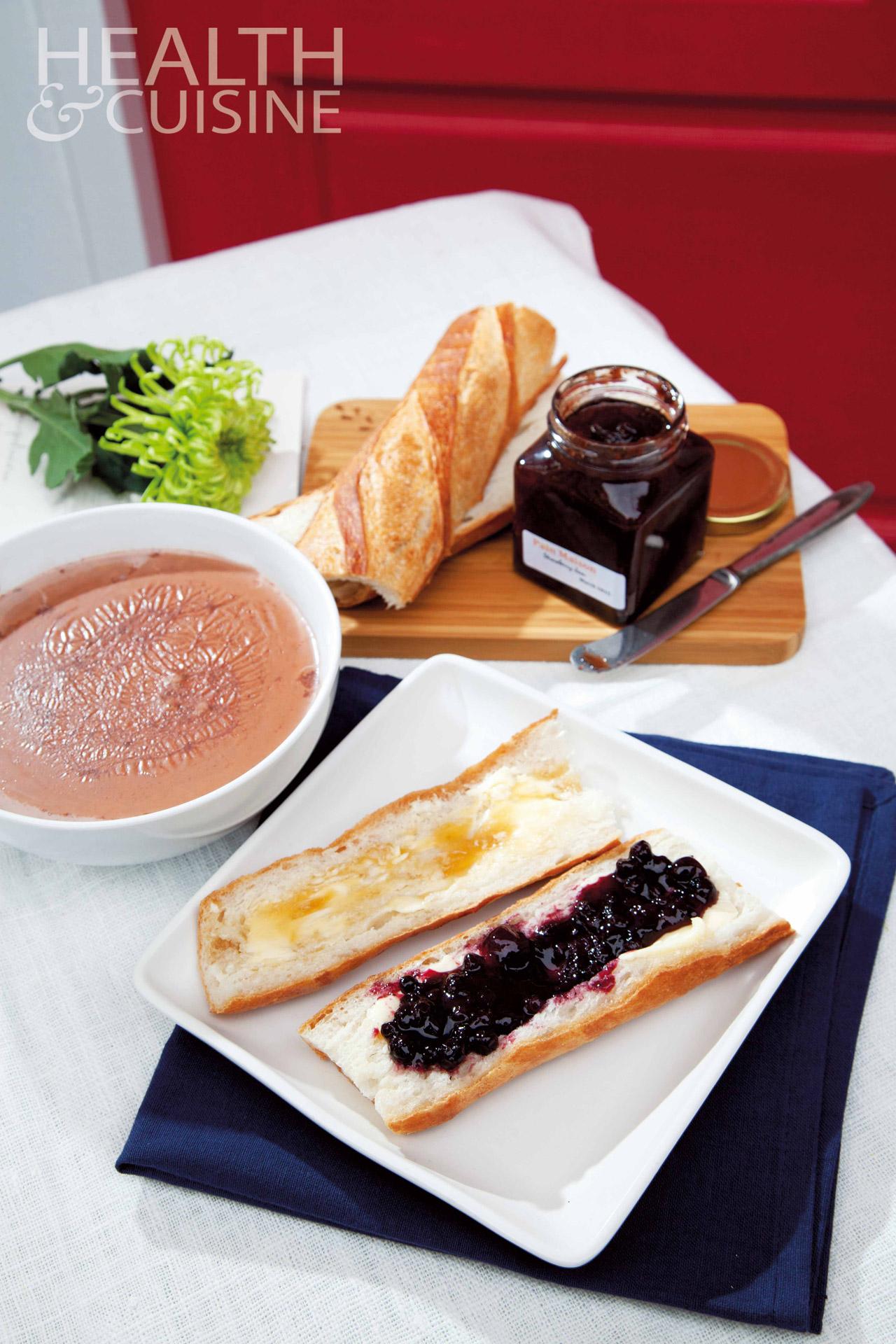 2. ทาเนยบนขนมปังฝรั่งเศสผ่าครึ่ง ตามด้วยแยมโฮมเมดชนิดที่ชอบ ก่อนราดน้ำผึ้ง รับประทานพร้อมโกโก้