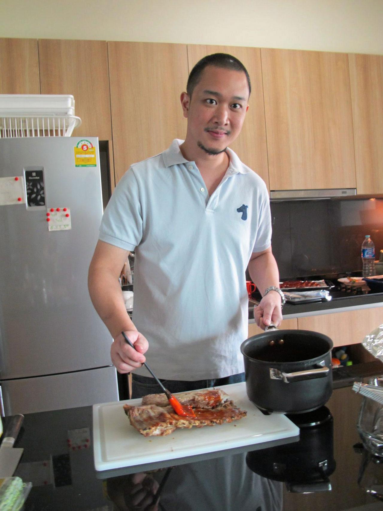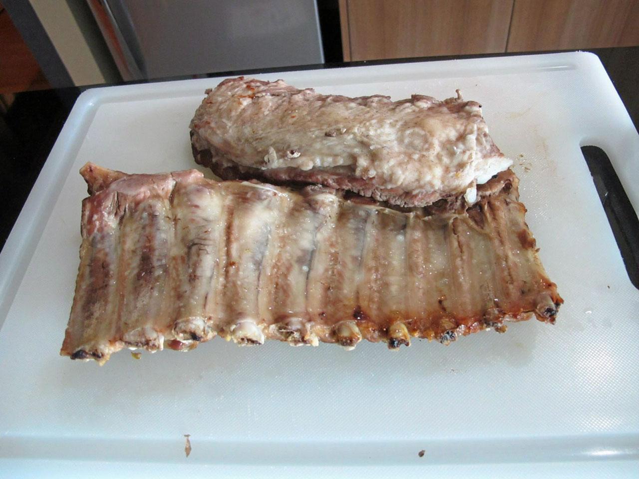 การทำ BBQ ribs เริ่มจาก ต้มซี่โครงหมู ก่อน เพื่อเป็นการทุ่นเวลาในกรณีไม่มีเตาย่างบาร์บีคิว โดยใช้น้ำสะอาด 1 ลิตร ต้มกับข่า (ทุบให้กลิ่นออก) 2 แง่ง/ เมล็ดพริกไทยดำ 1 ช้อนโต๊ะ/ใบกระวาน 3 ใบ/ซีอิ๊วขาว 200 มล. จนเดือด จากนั้นล้างและหั่นซี่โครงหมูตามขนาด ที่ต้องการใส่ลงหม้อ รอจนน้ำเดือดอีกครั้งแล้วหรี่ไฟลงให้เดือดอ่อน คอยช้อนฟองออก และเคี่ยวไปจนเนื้อนิ่มในระดับที่ต้องการ เมื่อจะนำซี่โครงหมูไปย่างจึงค่อยโรยผง dry rubs บนซี่โครงหมูที่ต้มสุกได้ที่แล้ว แล้วทาซอส BBQ ทับให้ทั่วซี่โครงหมู ก่อนนำไปย่างไฟจนเกรียมสวย ในขณะย่างให้ทาซอส BBQ ซ้ำ 2-3 ครั้ง