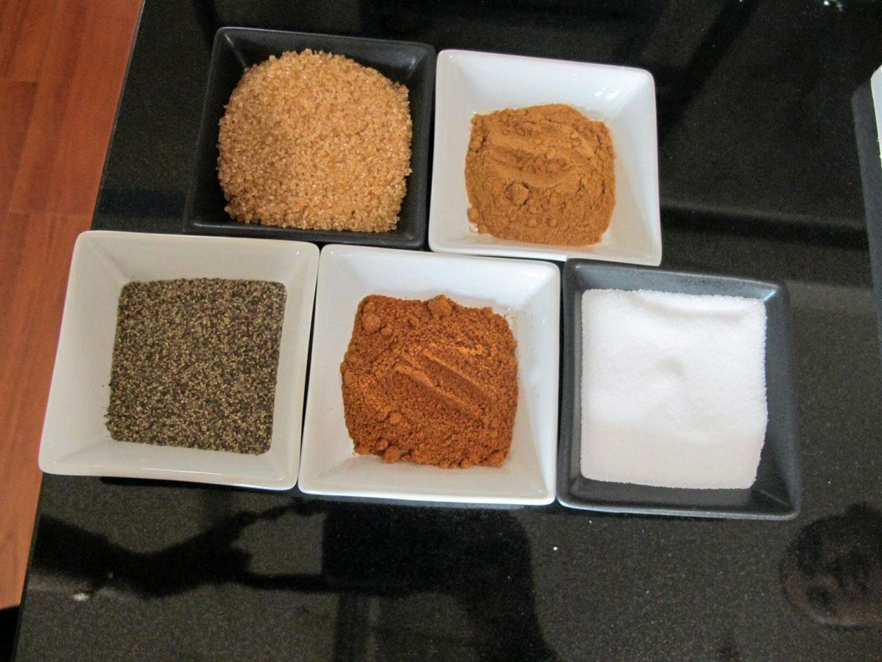 ส่วนผสม Basic dry rubs ซึ่งเป็นผงโรยแห้งซึ่งจะทำให้ BBQ Ribs มีรสจัดออกเผ็ดนิดๆ : ผงปาปริก้า 2 ช้อนโต๊ะ/พริกไทยดำบดละเอียด 1 ช้อนโต๊ะ/ผงหัวหอม 2 ช้อนชา/ผงกระเทียม 2 ช้อนชา/พริกป่นบดละเอียด 1 ช้อนชา/เกลือ 1 ช้อนโต๊ะ/น้ำตาลทรายขาว 1 ช้อนโต๊ะ ...ผสมทุกอย่างเข้าด้วยกัน
