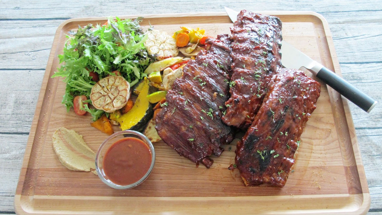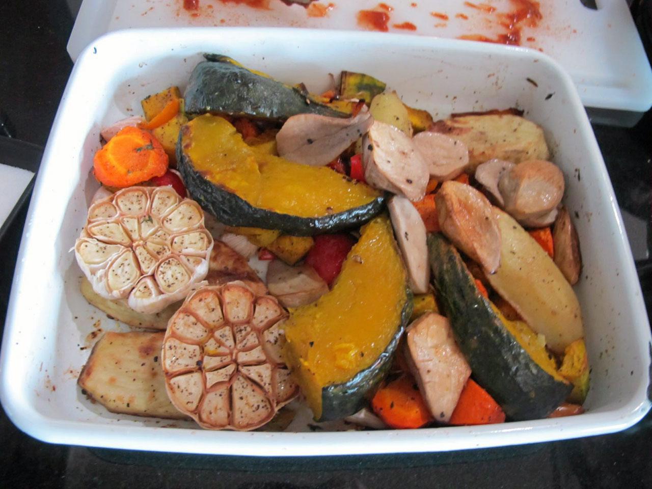 เสิร์ฟพร้อมกับผักย่าง อาทิ มันฝรั่ง แครอท ฟักทอง พริกหวาน เห็ดออเรนจิ กระเทียมหัว ใบไทม์ สด มีวิธีทำดังนี้ 1) หั่นผักต่างๆเป็นขนาดเท่าๆกันประมาณ 1 นิ้ว 2) ผ่าครึ่งกระเทียมตามแนวขวางโดยไม่ต้องปอกเปลือก 3) นำผักทั้งหมดคลุกกับน้ำมันมะกอกแค่พอเคลือบผิว 4) เด็ดใบไทม์โรยให้ทั่ว 5) ปรุงรสด้วยเกลือพริกไทยและ คลุกให้เข้ากันอีกครั้ง 6) นำไปย่างบนกระทะไฟกลางจนสุก.
