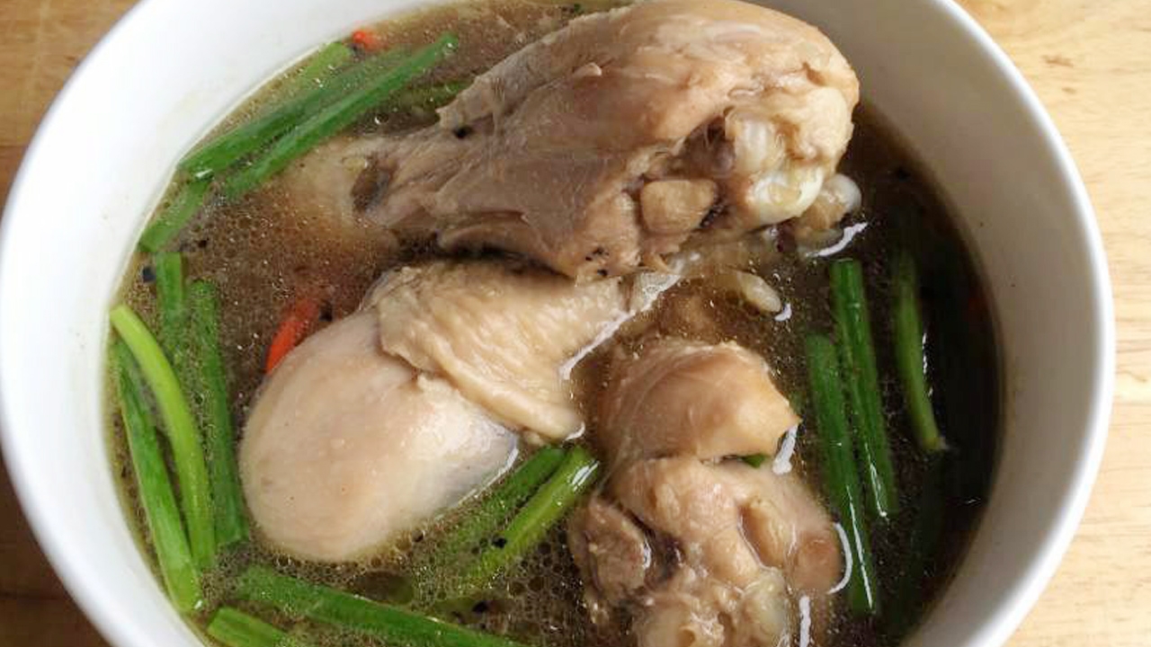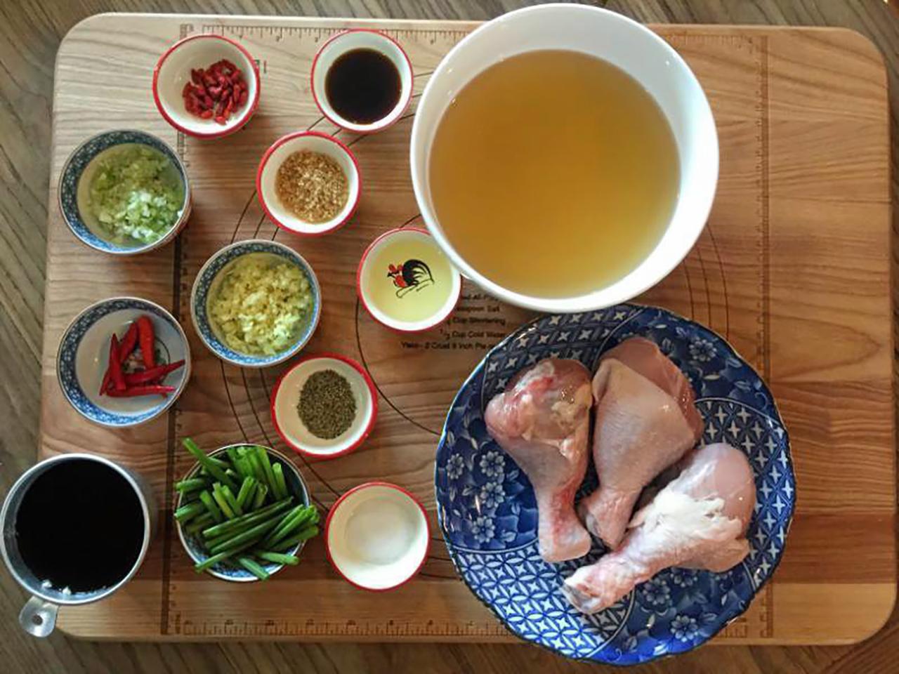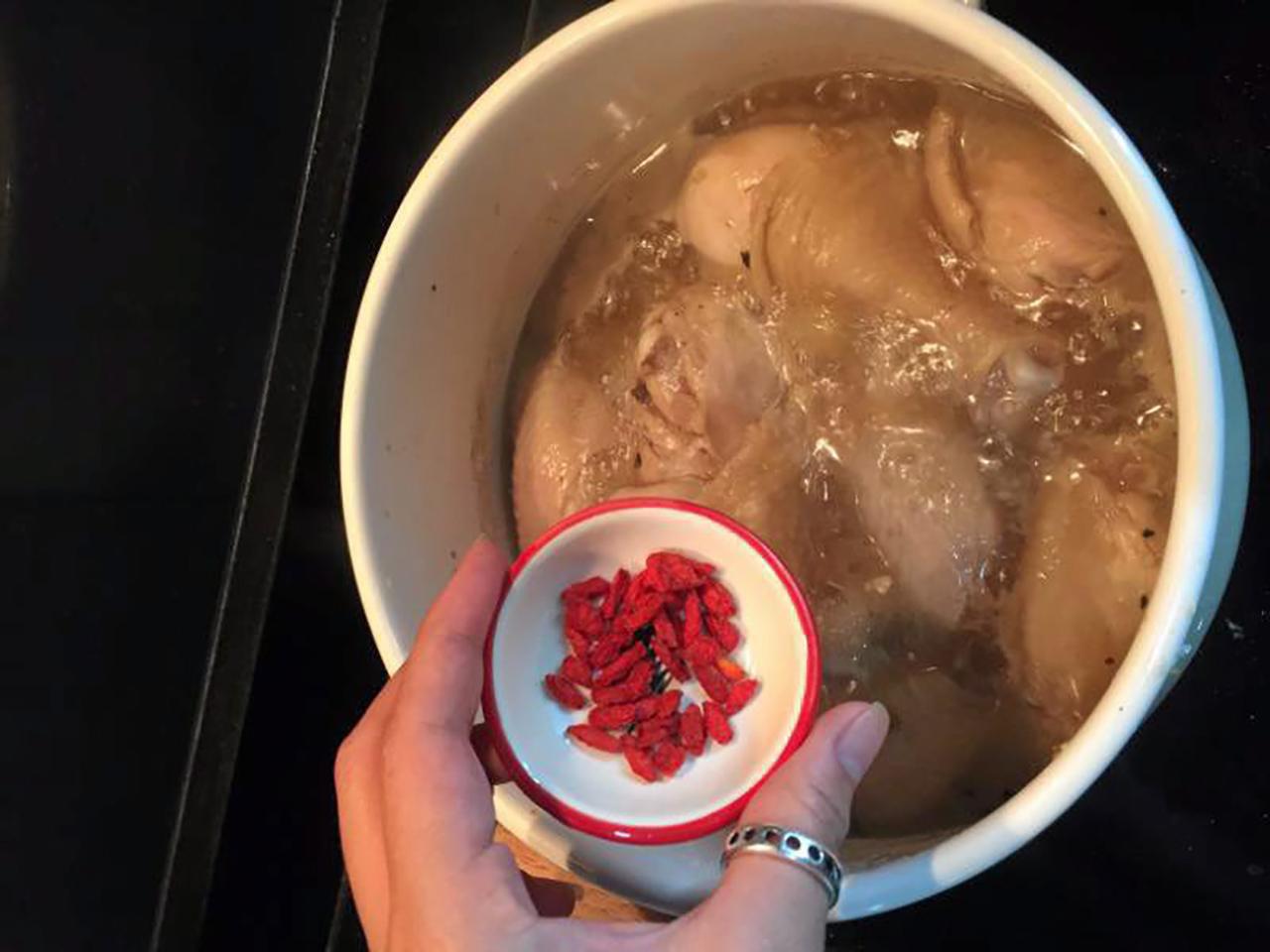 ใส่น่องไก่ เกลือ น้ำตาล ซีอิ๊วขาว ลงไปผัดพร้อมกัน จนหนังไก่เริ่มตึง 3. เติมน้ำซุปไก่ลงไปจนปริ่มน่องไก่ จากนั้นเติมเหล้าจีนลงไปแค่ครึ่งถ้วยพอที่เหลือเก็บไว้ใส่ตอนหลัง 4. ตุ๋นไปเรื่อยๆจนน้ำซุปงวดลงครึ่งหนึ่ง และน่องไก่เริ่มเปื่อยจึงเติมพริกสด (ไม่ต้องทุบ) และเก๋ากี้ลงไปตุ๋น รอสักห้านาทีจึงเติมเหล้าจีน ส่วนที่เหลือลงไป ใช้ไฟอ่อนๆตุ๋นต่อไปจนไก่เปื่อยนุ่ม จึงตักใส่ชามเสิร์ฟ โรยพริกไทยและต้นหอมที่หั่นเตรียมไว้.