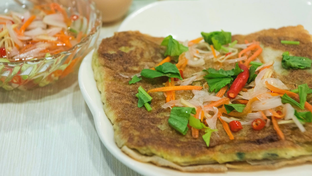 2) ฟาดแป้งโรตีอีกแผ่น แล้วนำแป้งโรตีแผ่นเล็กที่ทอดสุกแล้วมาวางบนแป้งโรตีที่ฟาดแผ่เป็นแผ่นใหญ่