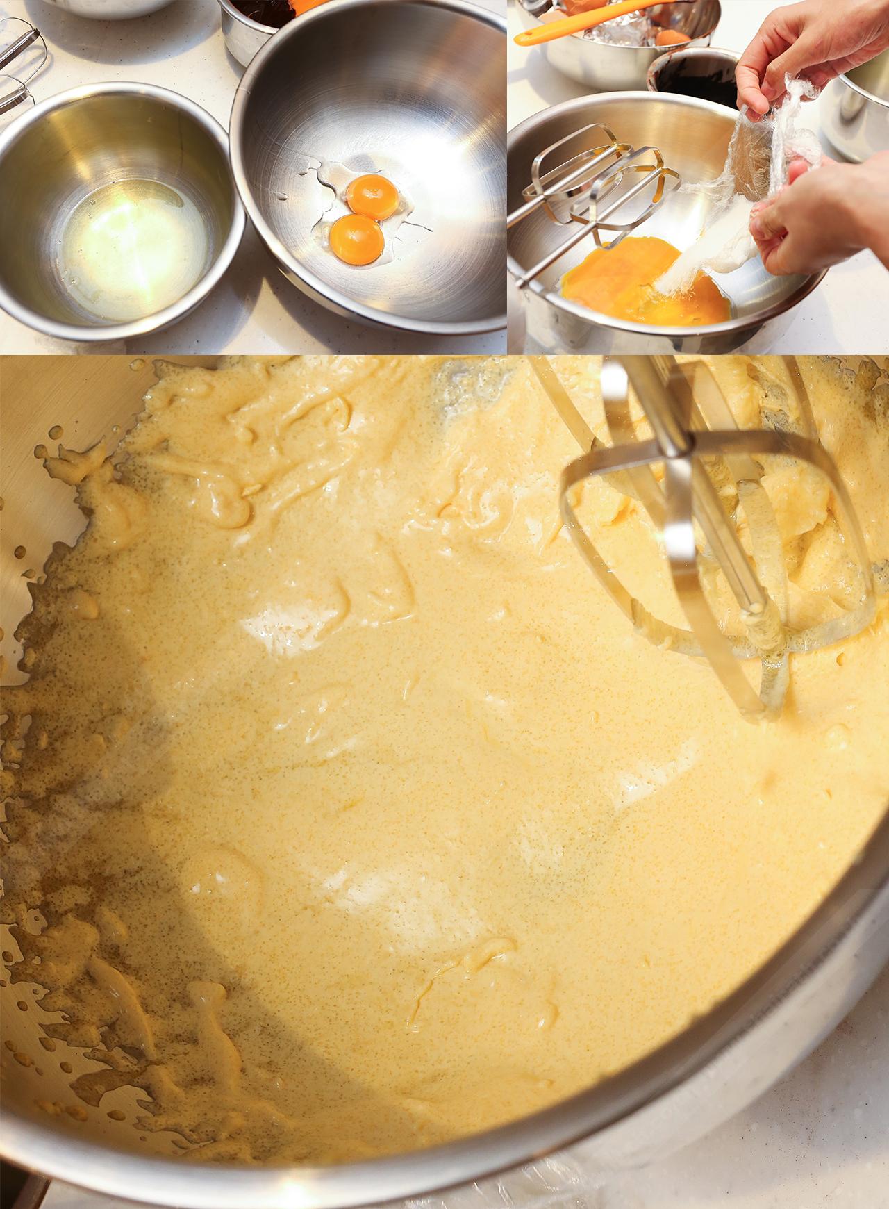 3. แยกไข่แดงและไข่ขาว ใส่ไข่แดงและน้ำตาลลงในชามอีกใบ ใช้เครื่องตีจนส่วนผสมมีสีขาวขึ้น