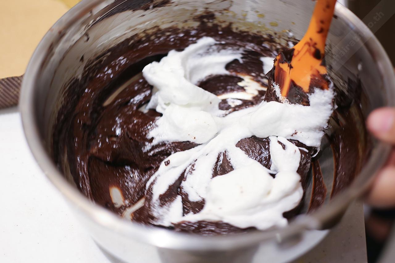 7. เติมส่วนผสมข้อ 5 ลงไปโดยแยกตัก 2-3 ครั้ง ตะล่อมส่วนผสมให้เข้ากันอย่างเบามือเพื่อป้องกันฟองยุบตัว