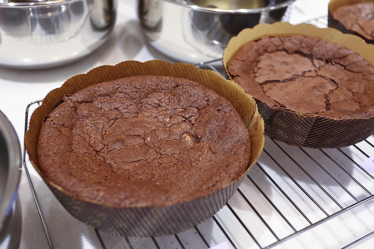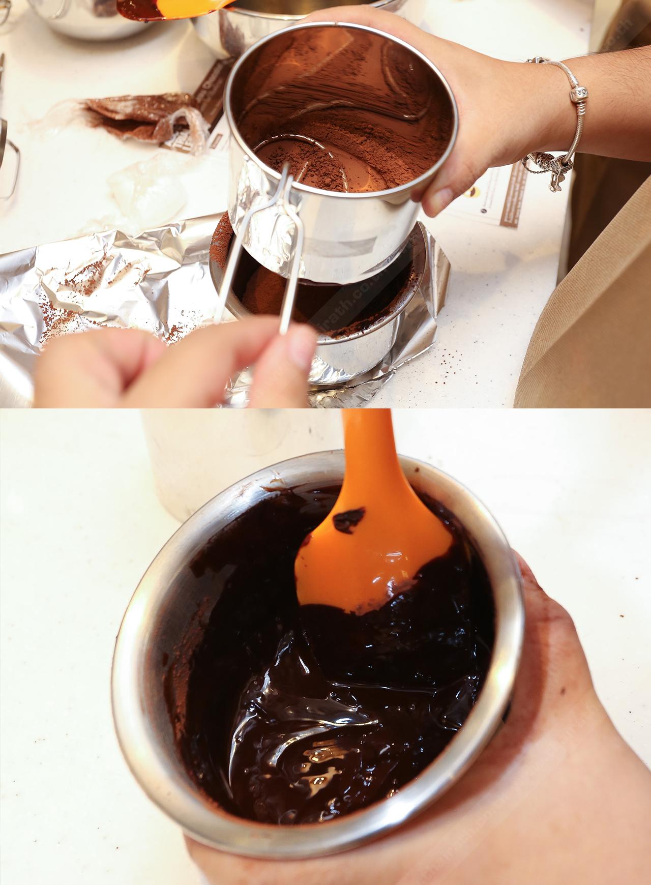 1. ร่อนผงโกโก้กับแป้งเค้กเข้าด้วยกันแล้วพักไว้