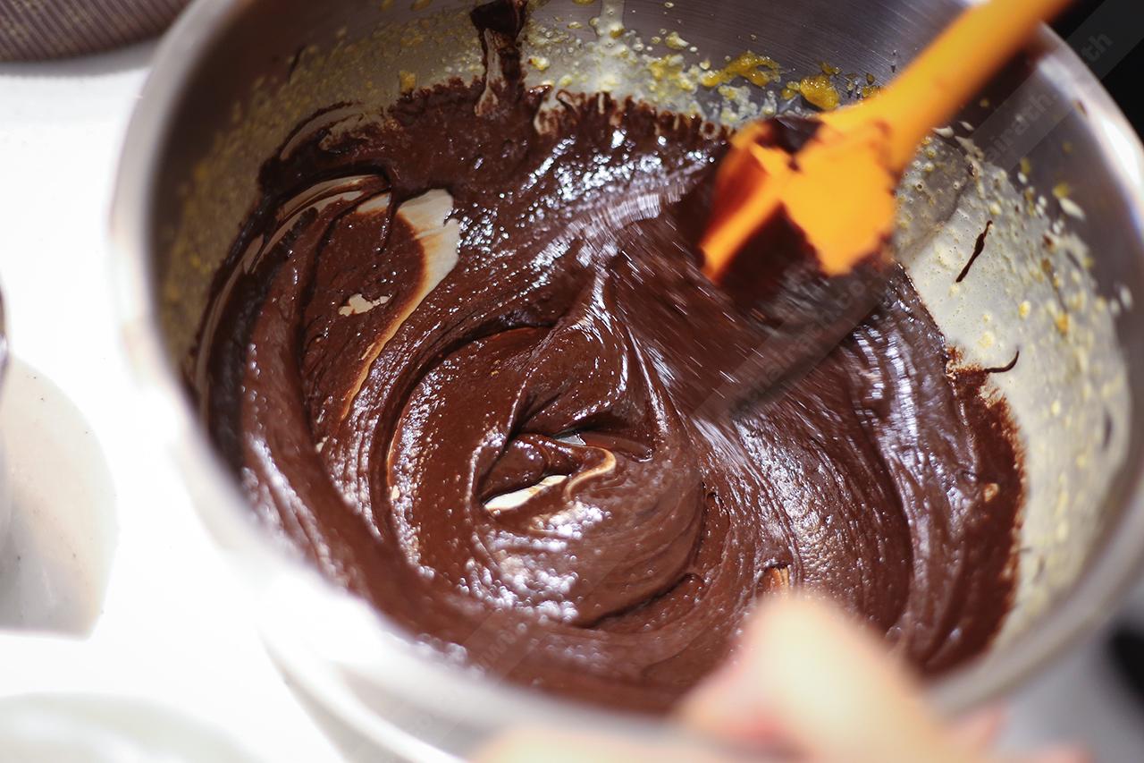 6. เติมส่วนผสมข้อ 3 ลงในข้อ 2 ใช้ไม้พายยางคนให้เข้ากัน