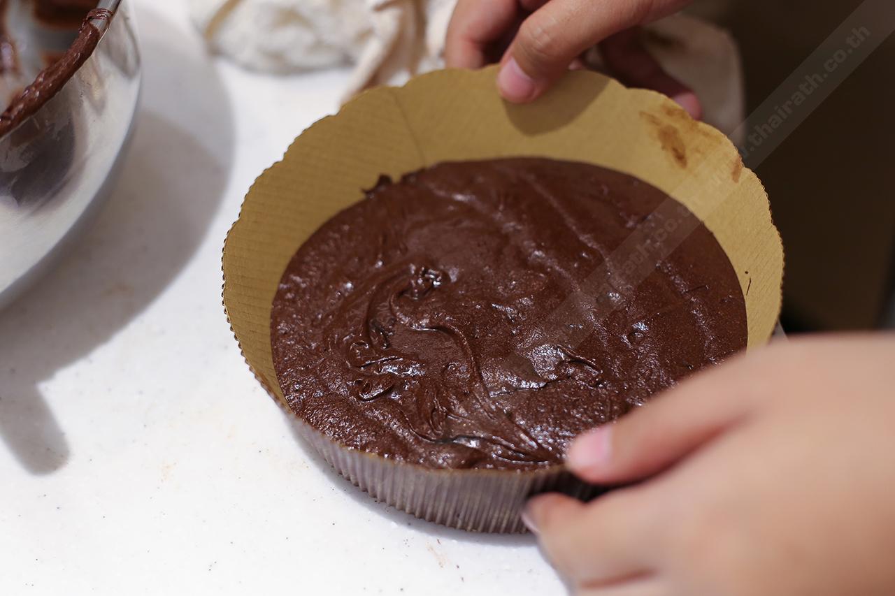 8. เทส่วนผสมลงในพิมพ์แล้วนำเข้าเตาอบ เตาอบไฟฟ้าตั้งไฟที่ 160 องศา เตาอบแก๊สตั้งไฟไว้ที่ 150 องศา ใช้เวลา 40 นาที