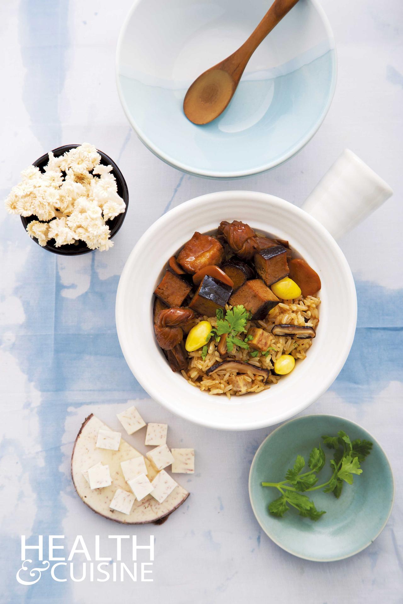 2. เตรียมผัดข้าว โดยตั้งกระทะใส่น้ำมันรำข้าว พอร้อนใส่กระเทียมลงเจียวจนหอม จากนั้นใส่เห็ดหอมลงไปผัดให้เข้ากัน เติมข้าว แปะก้วย และเผือกลงผัดให้เข้ากัน ปรุงรสด้วยซีอิ๊วขาว ซอสปรุงรส น้ำตาลทราย และพริกไทย ผัดให้เข้ากันอีกครั้ง ปิดไฟ ยกลง