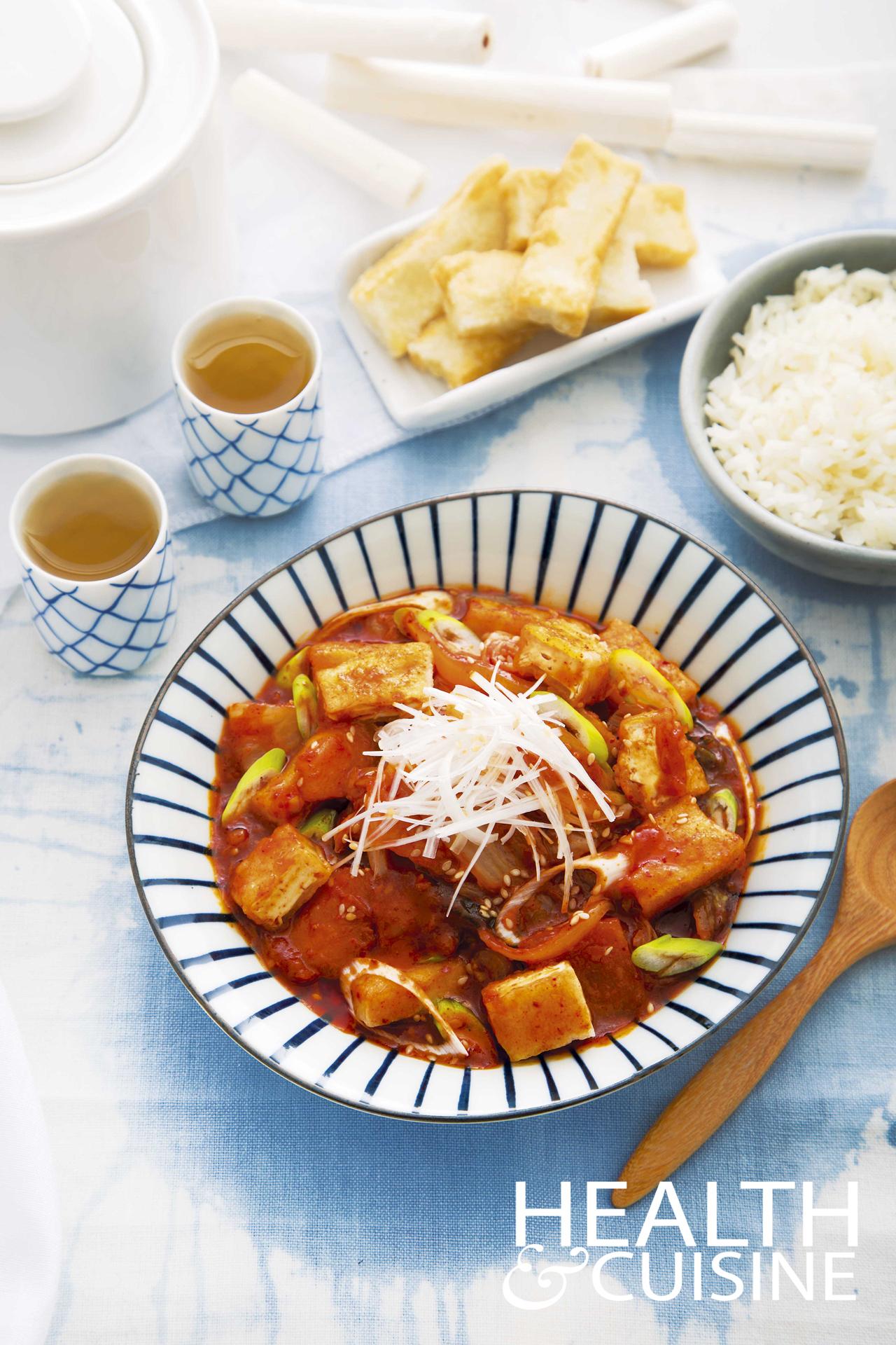 เมนูนี้ส่วนใหญ่จะมีขายตามร้านอาหารญี่ปุ่นหรือเกาหลี นิยมผัดกิมจิกับหมูหรือไก่ เรานำมาปรับให้เข้ากับคอนเซปต์เล่ม โดยเปลี่ยนเป็นเต้าหู้แข็งโมเมนของญี่ปุ่นแทน นำไปคลุกแป้งทอดจนเหลืองกรอบก่อนผัด ปรุงรสด้วยพริกโกชูจังกลิ่นหอมรสหวานอมเผ็ดนิดๆ รับประทานกับข้าวร้อนๆ เข้ากันที่สุด