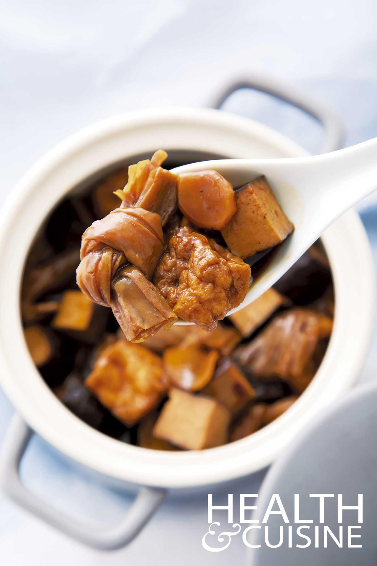 1. ทำเต้าหู้พะโล้ โดยผสมน้ำสต๊อกกับเครื่องปรุงทั้งหมดเข้าด้วยกัน เทใส่หม้อ เติมเต้าหู้ทั้งหมดและขิงลงไป ต้มจนส่วนผสมเดือด ลดไฟลง ต้มต่อจนน้ำในหม้อลดลงครึ่งหนึ่ง ปิดไฟ พักไว้