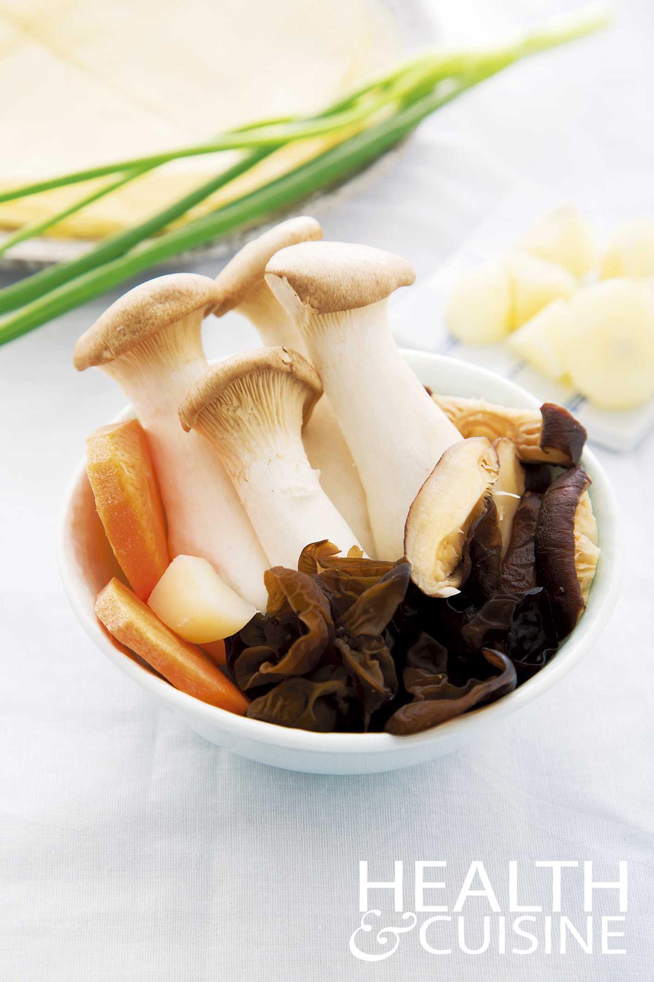 2. เตรียมผัดไส้ โดยตั้งกระทะใส่น้ำมันงาลงไปพร้อมกับกระเทียม ผัดจนมีกลิ่นหอม ใส่เห็ดทั้ง 3 ชนิดลงไป ตามด้วยแครอตและแห้ว ผัดให้เข้ากัน เติมน้ำสต๊อก พอเดือด ปรุงรสด้วยซีอิ๊วขาว ซอสเห็ดหอม ซอสปรุงรส น้ำตาล และพริกไทย ผัดให้เข้ากัน พอเดือดอีกครั้ง ใส่แป้งที่ละลายน้ำไว้ลงไป ผัดจนแป้งสุก และส่วนผสมข้นขึ้น ปิดไฟ ยกลง พักให้เย็น