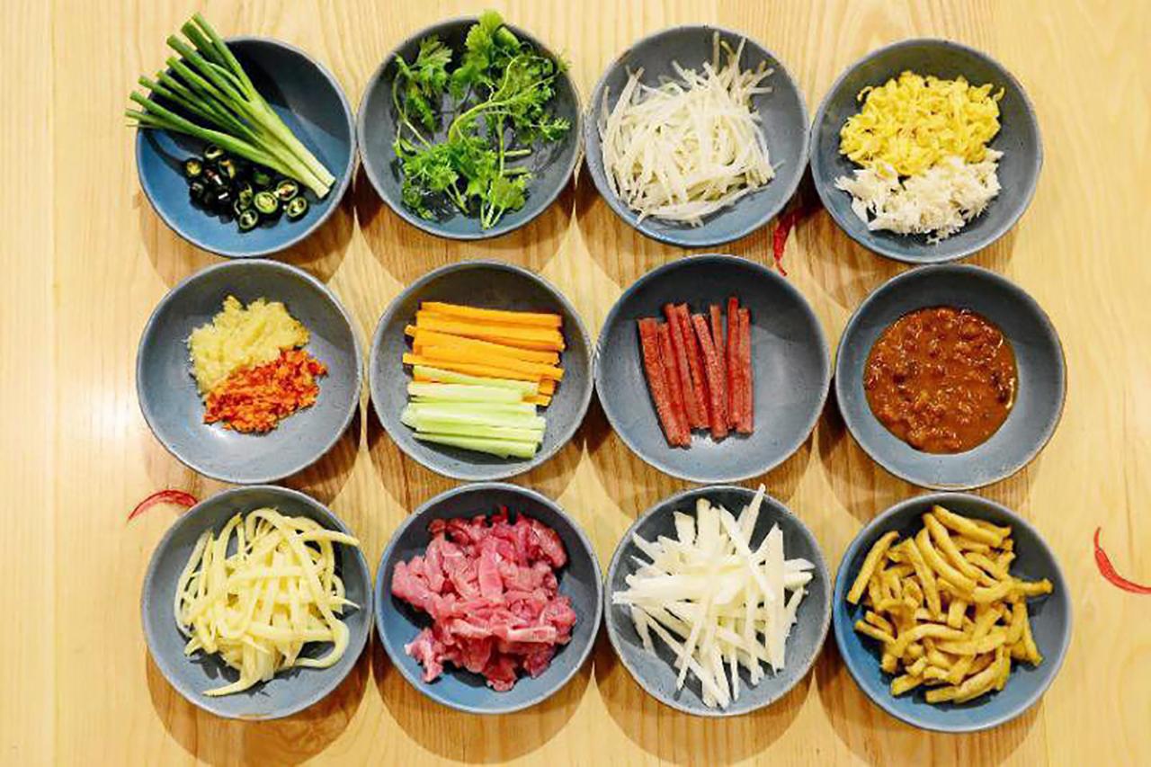 ส่วนประกอบของไส้ปอเปี๊ยะ: แตงกวา หรือแตงร้าน/ แครอท/ กุนเชียง/ ไข่ม้วนซอย/ ถั่วงอกลวก/ ผักชี/ พริกชี้ฟ้าสีเขียว/ พริก และกระเทียมตํา