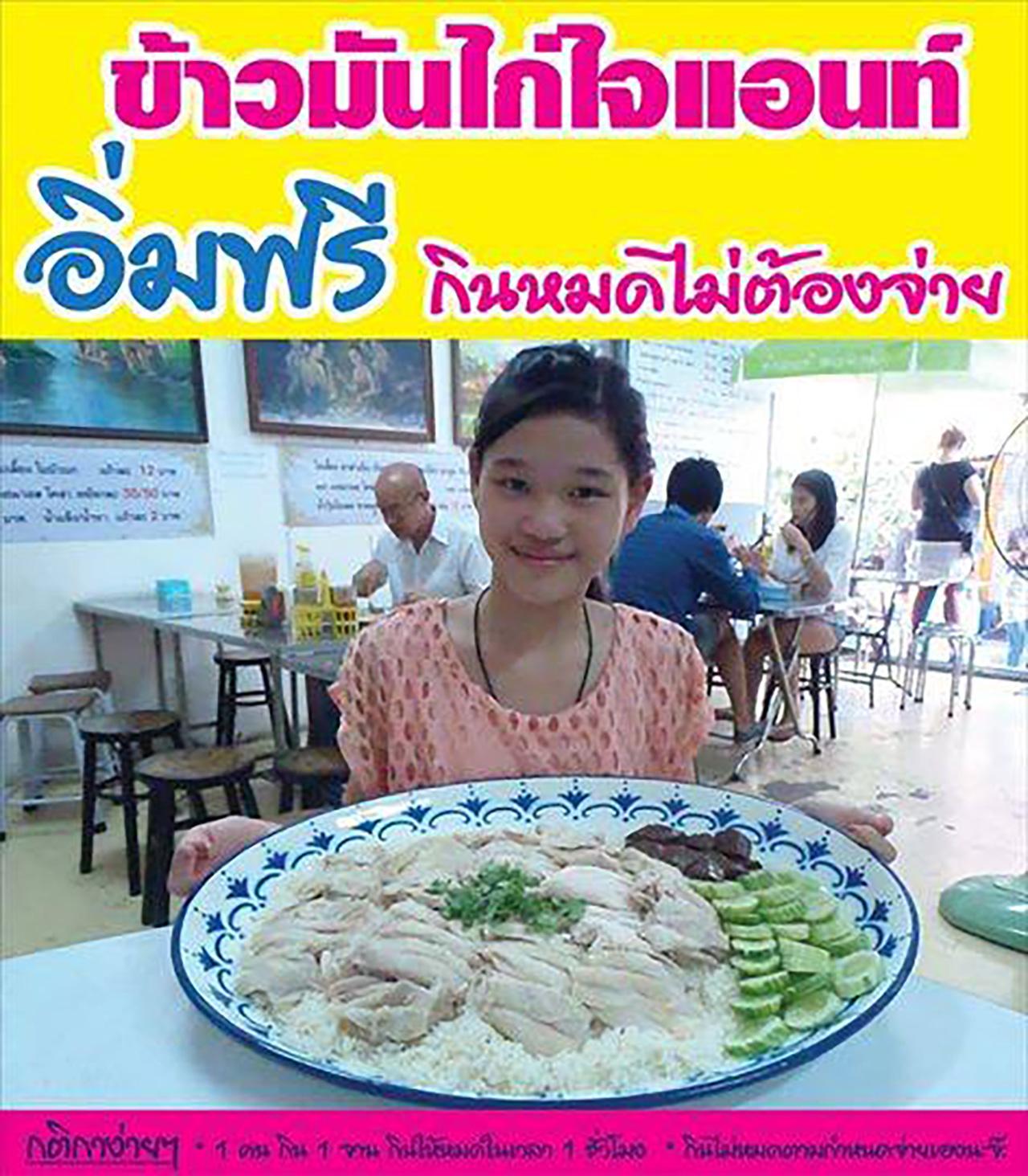 เมนูจานยักษ์นี้ก็คือ ข้าวมันไก่ไจแอนท์ ราคา 500 บาท ทางร้านขายแค่วันละ 6 จานเท่านั้น ใช้ไก่ 1 ตัว และข้าวมัน 2 กก. และยังมีเกมให้ร่วมสนุกด้วย โดยหากกินข้าวมันไก่ไจแอนท์ 1 คนต่อ 1 จาน และกินหมดในเวลา 1 ชั่วโมง ก็จะได้กินฟรีๆ ไปเลย