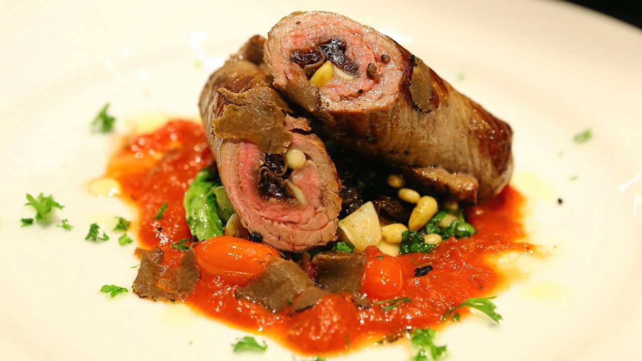 2) นำเห็ดทรัฟเฟิลดำ ถั่วไพน์นัทที่อบแล้ว ลูกเกด กระเทียม พาสลีย์ วางบนเนื้อส่วนสะโพกที่ทุบไว้ โรยเกลือ พริกไทย จากนั้นม้วนให้เป็นแท่งกลม แล้วกลัดด้วยไม้จิ้มฟันให้อยู่ทรง