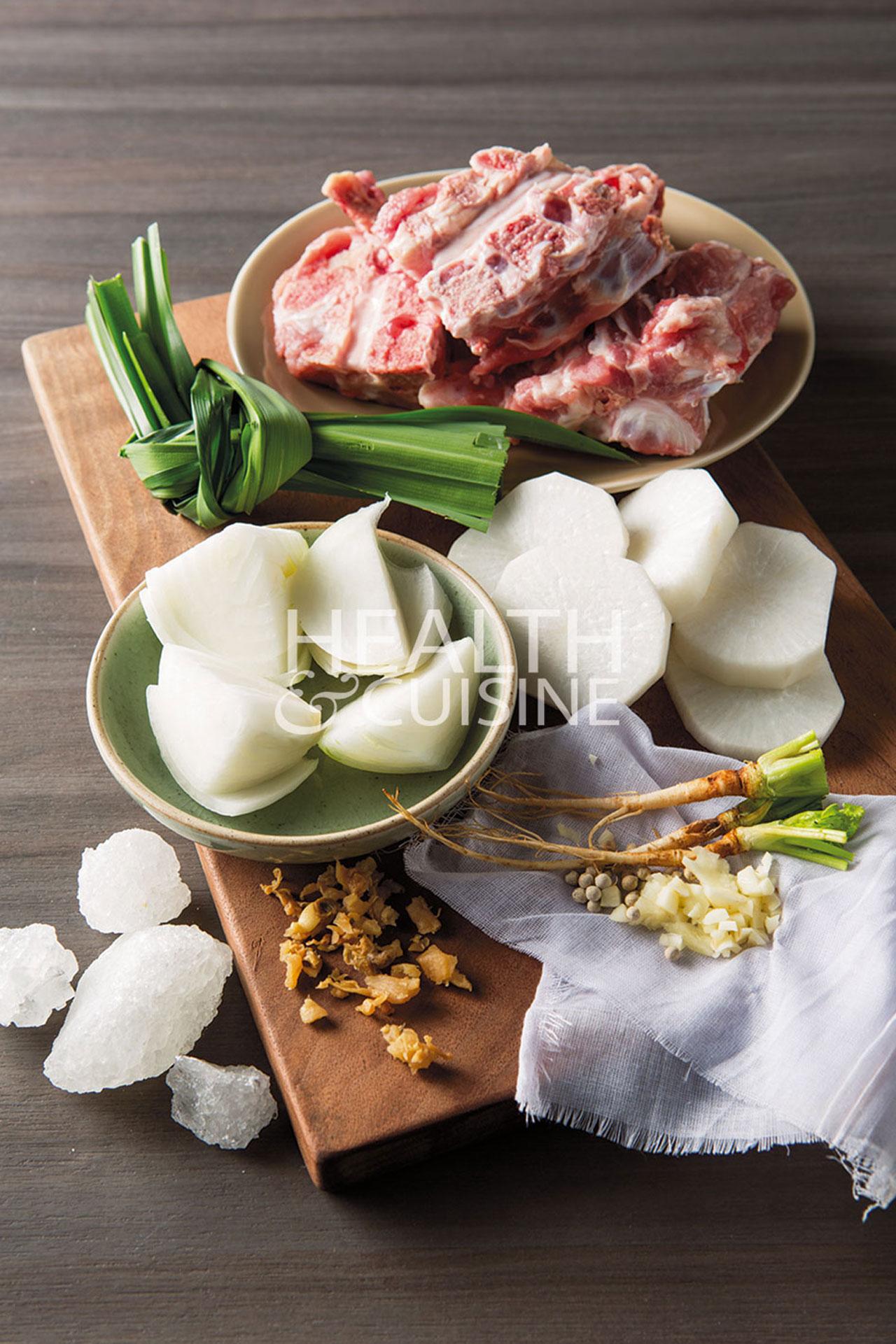 3. พอน้ำซุปเริ่มใสขึ้น จึงใส่หอมใหญ่ หัวผักกาด และใบเตยลงไป ต้มนาน 30 นาที