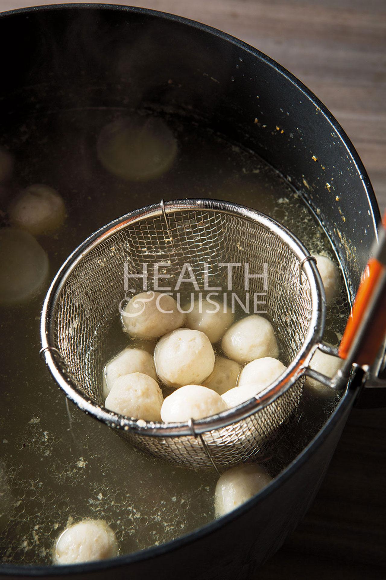 จากนั้นก็จะใช้ “น้ำแช่ลูกชิ้น” ไปทำน้ำซุป โดยใส่กระดูกหมูและหัวผักกาดลงไป แล้วใส่ลูกชิ้นลงไปต้มในน้ำซุปนี้จนสุกพร้อมเสิร์ฟ ทำให้ได้น้ำซุปที่มีรสหวานหอมจากเนื้อปลาสดอย่างแท้จริง ทว่าขั้นตอนการทำที่สลับซับซ้อนเหล่านี้ อาจไม่เหมาะกับการทำกินที่บ้าน แต่หากอยากทำเองจริงๆ ก็ให้ประยุกต์ใช้ปลาโอแห้งของญี่ปุ่นมาต้มลงในซุป ก็ช่วยเพิ่มรสหอมหวานได้ดีทีเดียว”