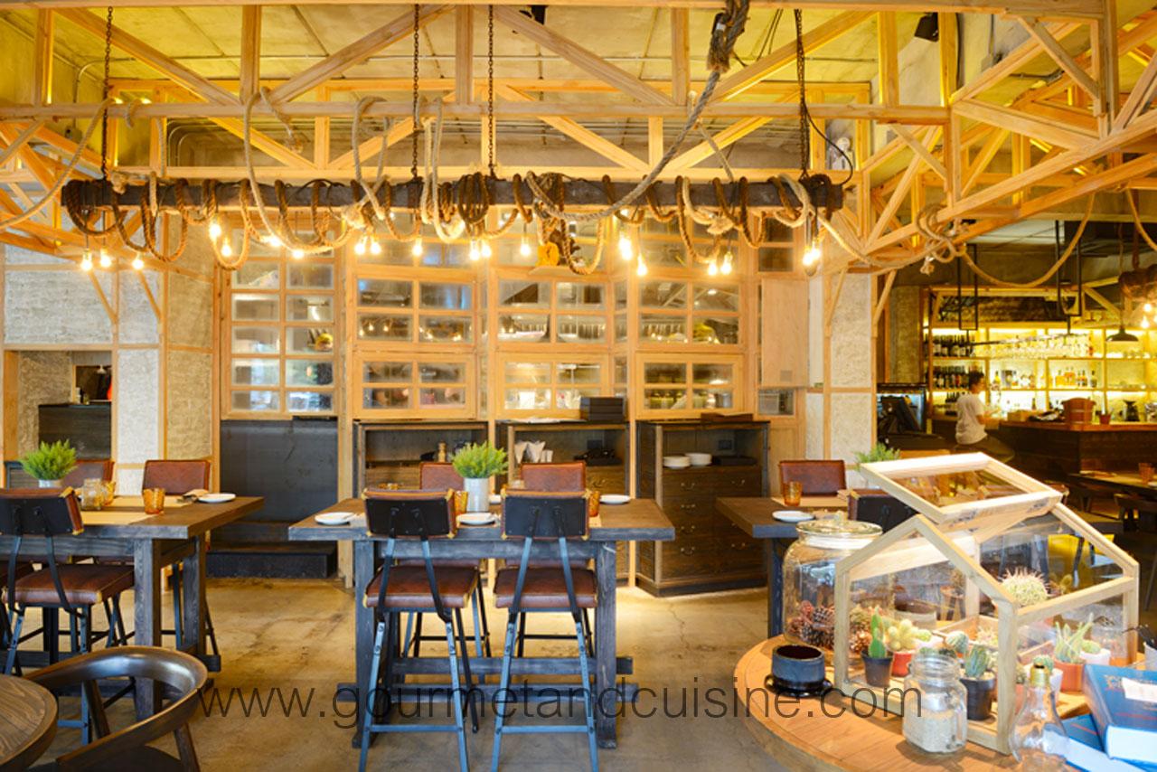 ส่วนบรรยากาศร้านจำลองเอากลิ่นอายของโรงนาเอาไว้ มีมุมเก็บเมล็ดพันธุ์พืชต่างๆ เก้าอี้ไม้ คานไม้ที่มีเชือกและรอกสำหรับงานในโรงนา และครัวเปิดที่ออกแบบเป็นบานพับสำหรับส่งอาหารเข้ามาในร้าน ซึ่งทำให้ที่นี่ค่อนข้างแคชชวลไดนิง แหวกแนวจากวอเตอร์ไลบารีที่หนักไปทางไฟน์ไดนิง