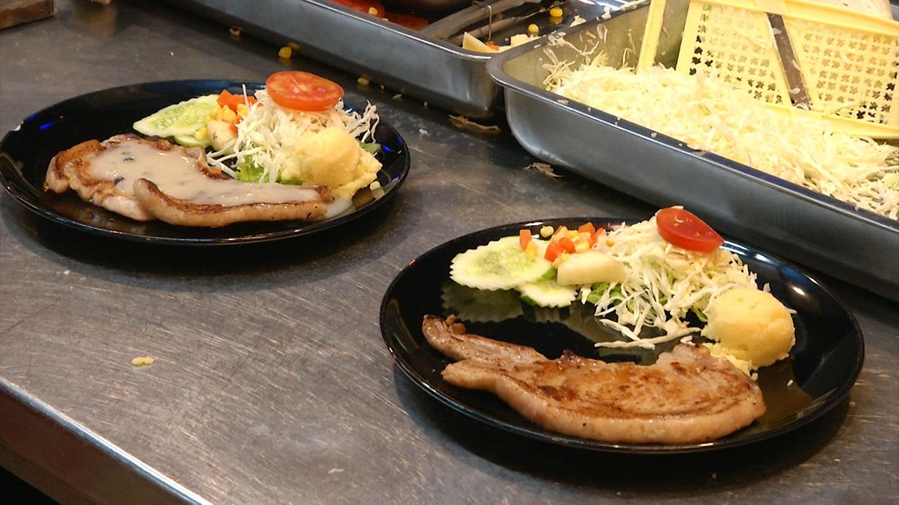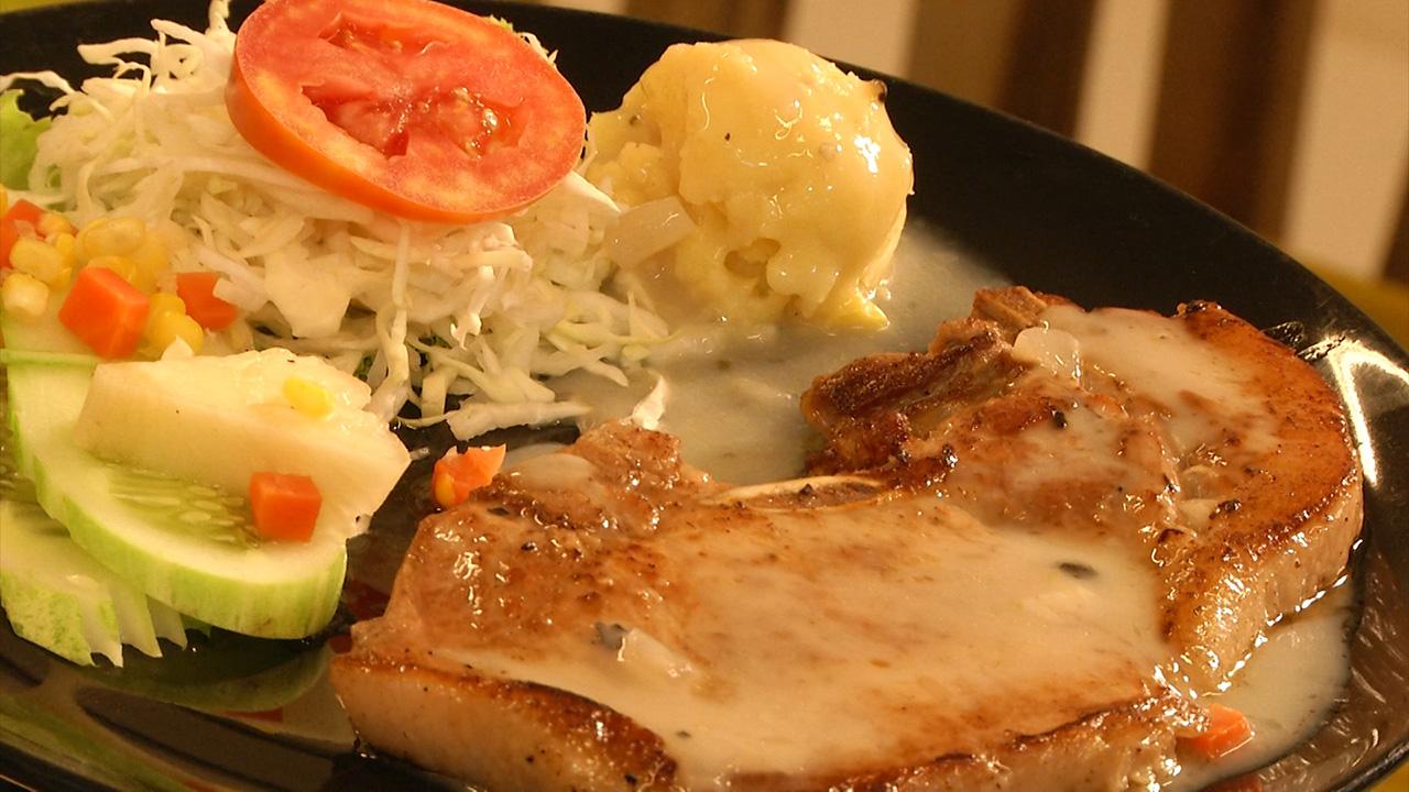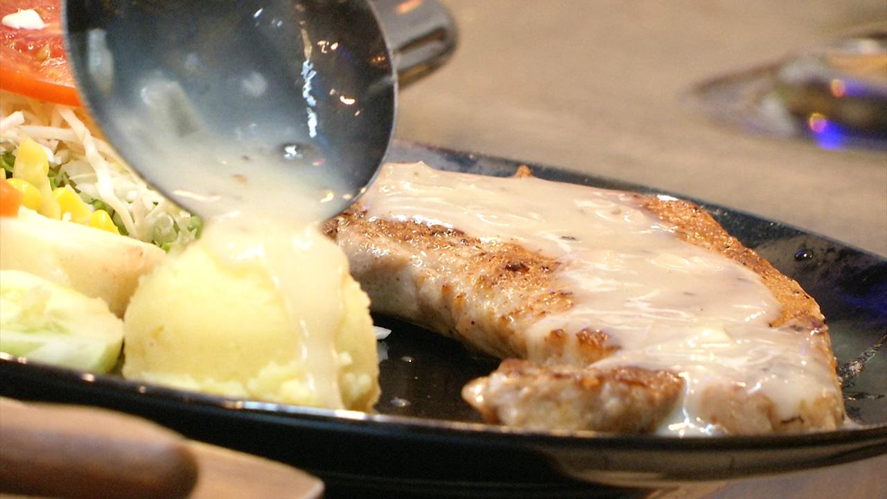 มาถึงเมนูไฮไลต์ เนื้อหมูสันนอกติดกระดูกหมักด้วยเครื่องปรุงจนเข้าเนื้อ ถูกนำมาทอดจนสุก เนื้อหนานุ่มชุ่มฉ่ำเครื่องเทศและเนยสด ราดด้วยน้ำเกรวี่รสชาติเข้มข้นสูตรของร้าน ให้รสเผ็ดและหอมพริกไทยดำอ่อนๆ ทานกับมันบดสูตรพิเศษของทางร้าน ที่ผสมกันอย่างลงตัวกับนม เนย ครีมเทียม และพริกไทย ทานคู่กับสเต๊กหมูพอร์คชอป เข้ากั๊น เข้ากัน