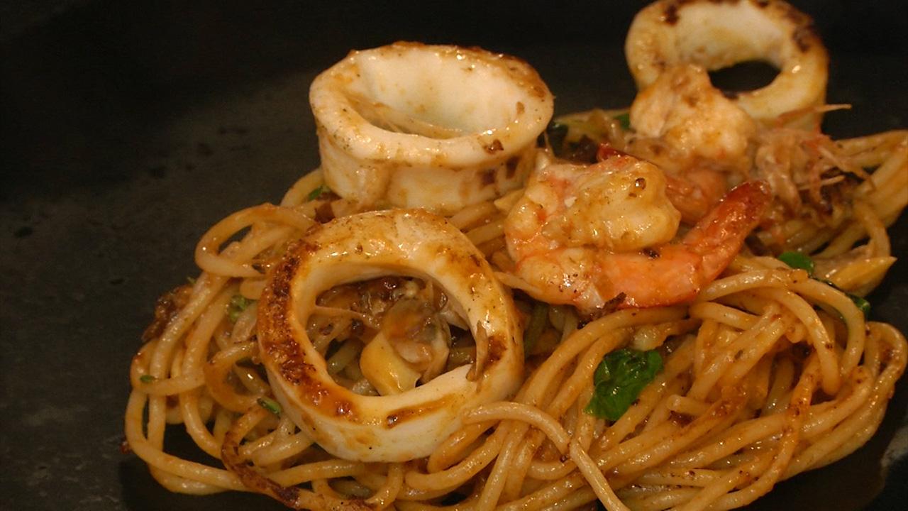 จานต่อไปเป็นเมนูเส้นรสเด็ด ปลาหมึกชิ้นโต กุ้ง หอย กระเทียม พริกแห้ง และเครื่องปรุงคลุกเคล้าให้สุกเข้ากัน ด้วยฝีมือเชฟที่คนแบบรัวๆ กับไฟร้อนๆ เมื่อทุกอย่างเข้าที่ก็นำเส้นสปาเกตตีเส้นเหนียวนุ่มลงคลุกเคล้า ราดด้วยซอส พริกไทย และน้ำเกรวี่ ตามด้วยใบโหระพา อื้มมมม...รสชาติแซ่บ เผ็ดร้อน อร่อยเต็มๆ คำสำหรับสปาเกตตีขี้เมาทะเล