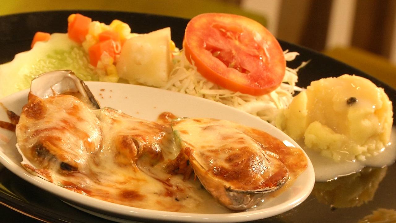 จานแรกแนะนำนี่เลย หอยแมลงภู่นิวซีแลนด์อบชีส หอยแมลงภู่ตัวโต๊โตเกือบเท่าฝ่ามือ ปรุงรสด้วยเนยสด กระเทียมและพาสลีย์สับละเอียด ราดด้วยซอสมะเขือเทศตามด้วยน้ำเกรวี่นิดหน่อย และโรยหน้าด้วยมอสซาเรลล่าชีส ก่อนนำไปอบ จนชีสละลายเยิ้มๆ ออกสีเหลืองอ่อนๆ กลิ่นหอมยั่วน้ำลายมาแต่ไกล